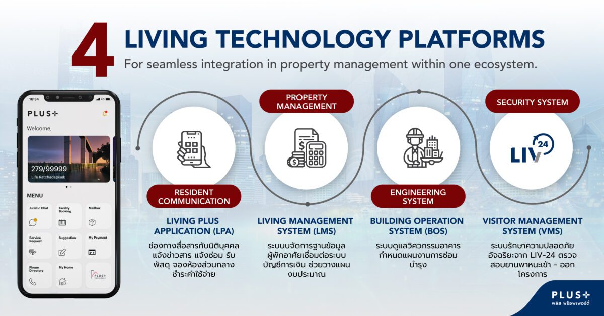 พลัสฯ มีการพัฒนาเทคโนโลยี Living Plus Application อย่างต่อเนื่อง ใช้เป็นเครื่องมือสำหรับสื่อสารและให้บริการกับลูกบ้าน ช่วยจัดการเรื่องต่างๆ ในชีวิตให้ได้รับความสะดวกสบาย รวมถึงเป็นช่องทางไว้ติดต่อสื่อสารกับนิติบุคคล อาทิ แจ้งข่าวสารในโครงการ แจ้งซ่อม รับพัสดุ จองห้องส่วนกลาง ชำระค่าใช้จ่ายโดยเชื่อมต่อกับ Platform ของธนาคาร สามารถผ่อนชำระค่าส่วนกลาง หรือชำระผ่านบัตรเครดิตได้ เป็นต้น โดยมีการเก็บข้อมูลการใช้งานจริงจากโครงการต่างๆ  มาพัฒนาฟังก์ชันการใช้งานได้ตรงกับความต้องการ นอกจากนี้ยังมีเทคโนโลยี Living Management System (LMS) ที่เป็น Platform ในการบริหารจัดการฐานข้อมูลผู้พักอาศัย โดยเชื่อมต่อระบบบัญชีการเงิน ช่วยในการวางแผนจัดสรรงบประมาณให้มีความเหมาะสม   สามารถตรวจสอบสถานะทางการเงินได้อย่างโปร่งใสไม่ว่าจะเป็นการจ่ายค่าส่วนกลาง  และค่าสาธารณูปโภค การทำธุรกรรมต่างๆ ยังเป็น Cashless มีความถูกต้องแม่นยำ ตรวจสอบได้   นอกจากเทคโนโลยีที่ดูแลเรื่องการอยู่อาศัยแล้ว ยังมี Platform ที่ใช้สำหรับดูแลระบบวิศวกรรมอาคาร Building Operation System (BOS) ที่เก็บข้อมูลเครื่องจักรในอาคาร มาประมวลผลและกำหนดแผนงานการซ่อมบำรุงที่ชัดเจนในการดูแล โดยเป็นการทำงานแบบ Preventive Maintenance ป้องกันก่อนที่จะเกิดความเสียหาย ซึ่งสามารถควบคุมมาตรฐานของช่างอาคาร ด้วยการสแกน QR Code เพื่อเข้าสู่แอปพลิเคชันเพื่อปฏิบัติงานตามแผนที่วางไว้ สามารถตรวจสอบการทำงาน ลดความผิดพลาดจาก Human Error โดยมีการแจ้งเตือนการทำงานที่ผิดปกติไปที่ผู้ดูแล เพื่อที่จะได้ทำการแก้ไขปัญหาได้ทันท่วงที  นอกจากนี้ยังสามารถเชื่อมต่อข้อมูลการแจ้งซ่อมจากผู้พักอาศัย จึงทำให้ฝ่ายจัดการฯ สามารถบริหารงานและติดตามการทำงานได้อย่างต่อเนื่อง โดยที่ผู้พักอาศัยสามารถรับทราบสถานะการให้บริการได้อีกด้วย  และสุดท้ายคือระบบการรักษาความปลอดภัยอัจฉริยะจาก LIV-24 ที่เชื่อมต่อระบบ Visitor Management System (VMS) ที่ใช้ในการตรวจสอบยานพาหนะที่เข้ามาในพื้นที่โครงการ โดยมีระบบอ่านป้ายทะเบียน (License Plate Recognition) ที่นำ AI เข้ามาใช้ เพื่อลดค่าใช้จ่ายในการลงทุนด้านอุปกรณ์ในการสแกนเข้าออก  รวมถึงเปิดช่องทางการลงทะเบียนเข้าโครงการล่วงหน้าผ่าน Living Plus Application และทำการ E-Stamp และชำระค่าที่จอดรถ เพื่อเพิ่มความสะดวกและปลอดภัยมากขึ้น