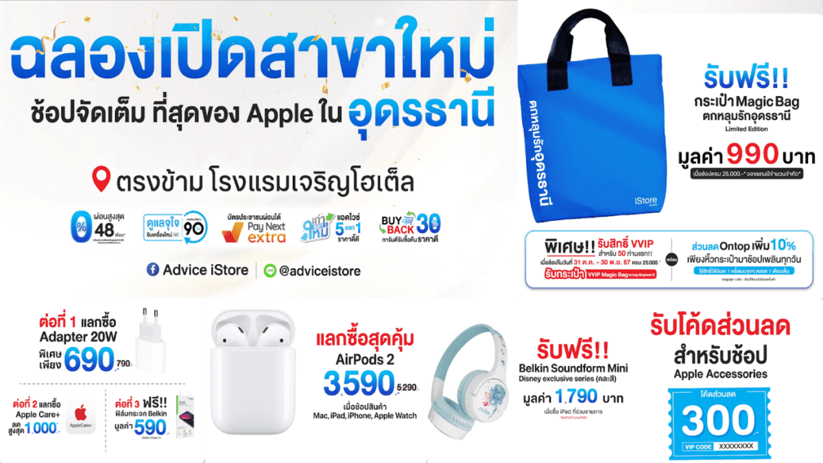 ไฮไลท์โปรโมชั่นต้อนรับการเปิด Advice iStore จ.อุดรธานี ระหว่างวันที่ 31 ตุลาคม – 30 พฤศจิกายน 2567