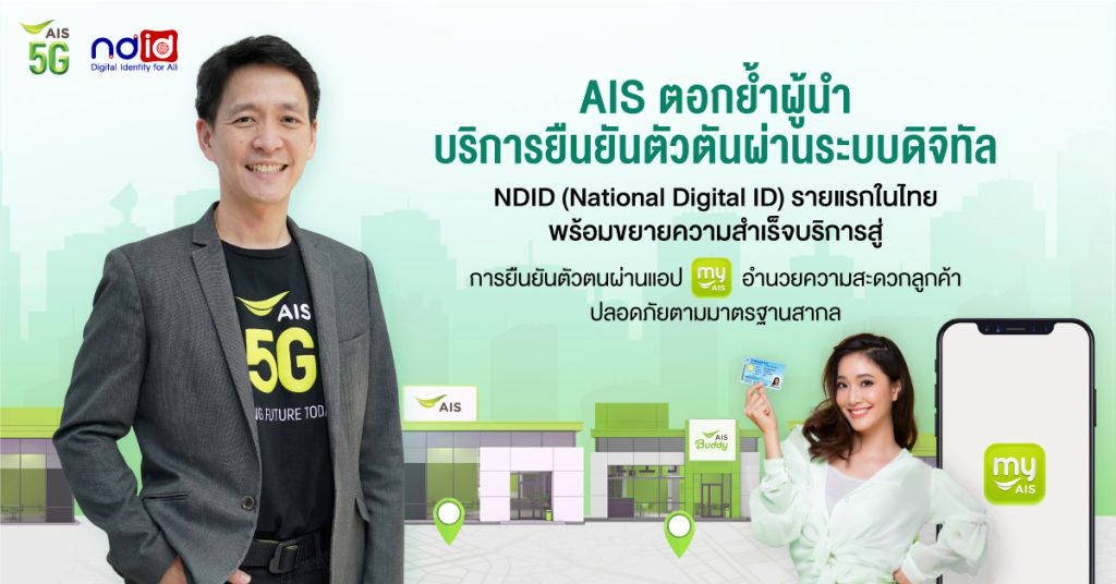 AIS ตอกย้ำผู้นำด้าน Digital Service กับบริการยืนยันตัวตันผ่านระบบดิจิทัล NDID (National Digital ID) รายแรกในไทย พร้อมขยายความสำเร็จบริการสู่ การยืนยันตัวตนผ่านแอป myAIS อำนวยความสะดวกลูกค้า ปลอดภัยสูงสุดตามมาตรฐานสากล