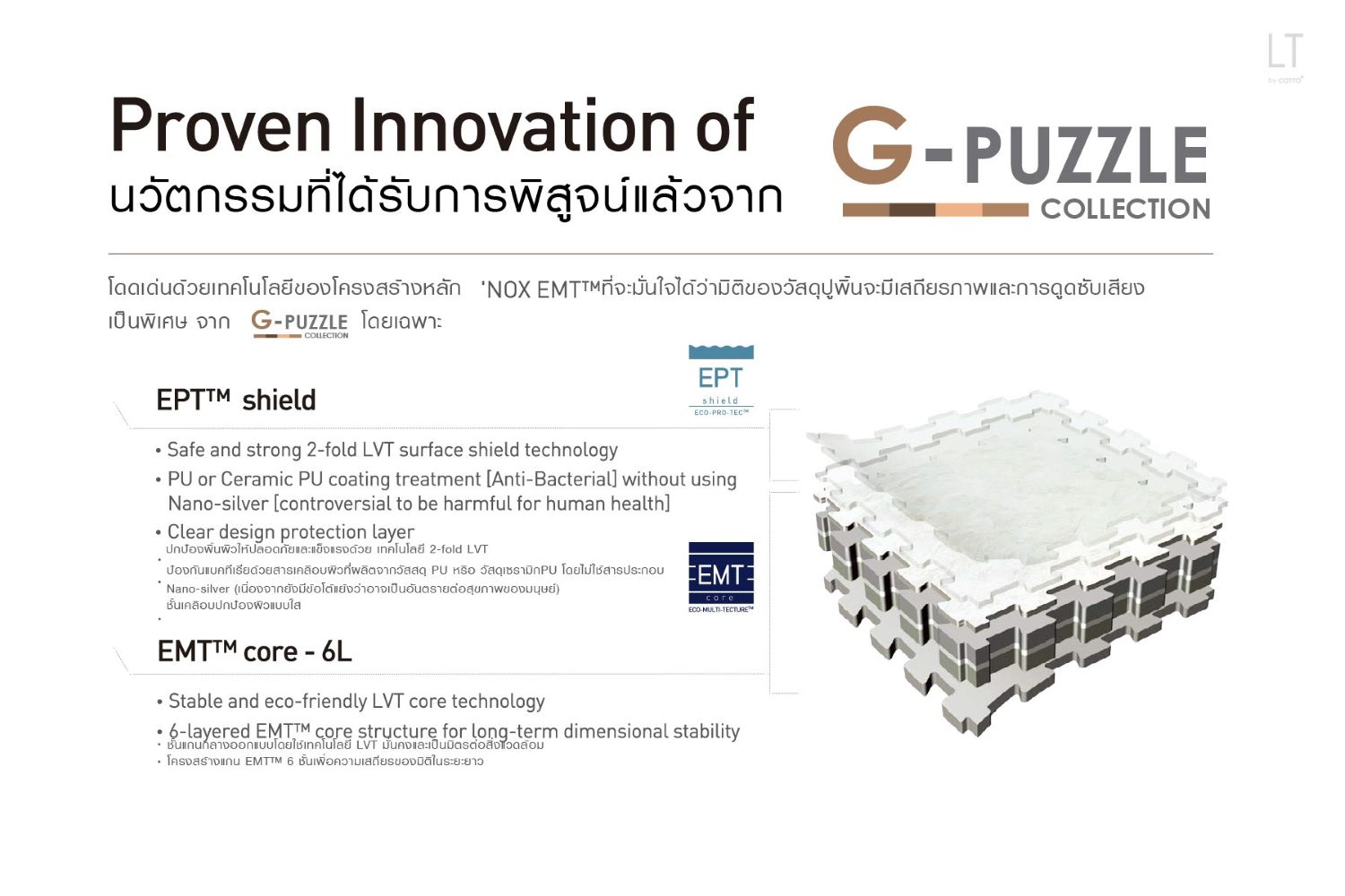 การเปิดตัว แผ่นปูพื้นอินเทอร์ล็อคแบบ G PUZZLE COLLECTION (จี พัสเซิล คอลเลคชั่น) นวัตกรรมวัสดุปูพื้นขนาด 36 x 36 นิ้ว มีความยืดหยุ่นที่สูง ดูดซับเสียงได้ดี มีความแข็งแรงคงทนสูง ด้วยโครงสร้างแบบ Multi-layer ถึง 6 ชั้น และพื้นผิวแบบ EPC (ECO-PRO-TEC) รองรับทุกกิจกรรมที่ส่งผลต่อพื้นโดยตรงได้เป็นอย่างดี ด้วยการออกแบบที่สามารถปรับแต่งเองได้ มอบสมดุลระหว่าง ความสวยงามและการใช้งานป้องกันแบคทีเรีย และไม่มีสารอันตรายปลอดภัยต่อผู้ใช้งาน มีคุณสมบัติที่เป็นมิตรกับสิ่งแวดล้อม จึงเหมาะอย่างยิ่งสำหรับการปูพื้นที่ออกกำลังกายและโรงยิมสามารถติดตั้ง เปลี่ยน และรื้อถอนได้ง่าย เพียงคลิ๊กล็อคประสานเข้าลิ้นแต่ละชิ้นเข้าด้วยกัน โดยไม่ต้องใช้กาว ประหยัดเวลา พร้อมใช้งานได้ทันที ดูแลรักษา ทำความสะอาดง่ายด้วย