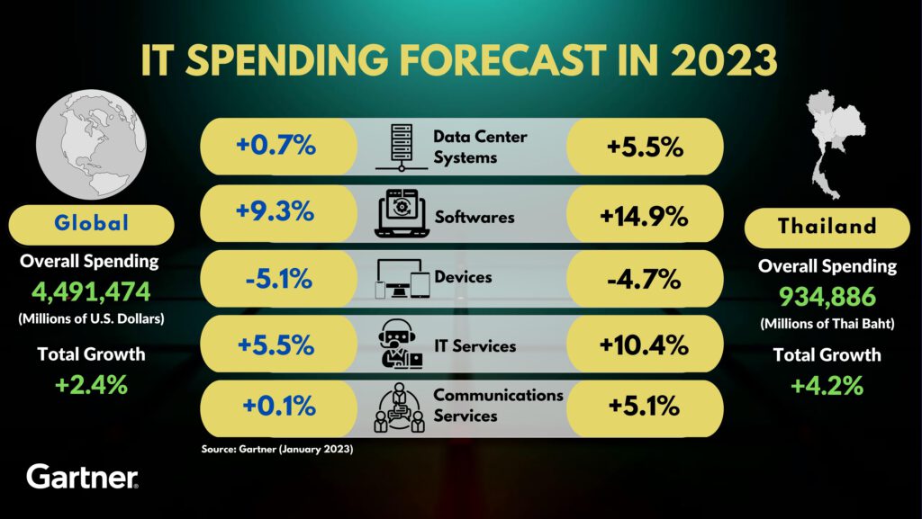 สำหรับยอดการใช้จ่ายด้านไอทีของประเทศไทยในปี 2566 คาดว่าจะสูงแตะ 934.9 พันล้านบาท เติบโตขึ้น 4.2% จากปี 2565 โดยในกลุ่มซอฟต์แวร์และกลุ่มบริการด้านไอทีจะเติบโตระดับเลขสองหลัก เนื่องจากองค์กรต่าง ๆ เพิ่มการใช้จ่ายกับโครงการดิจิทัล (ดูตารางที่ 2)