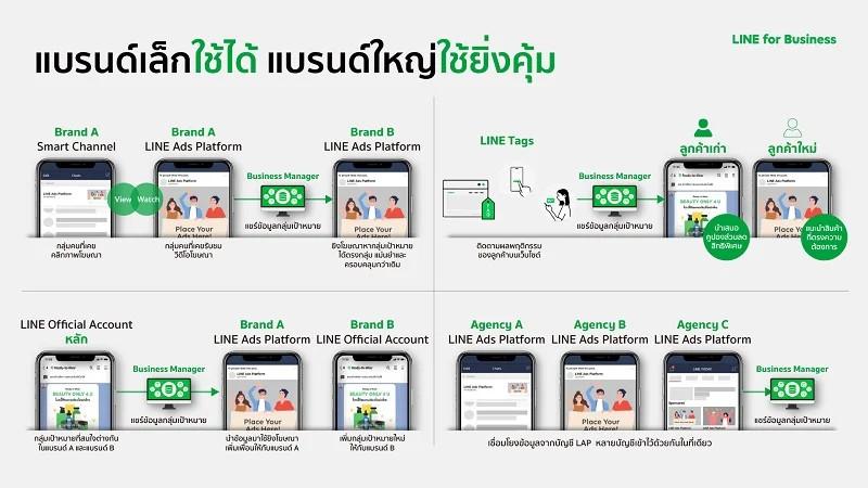สำหรับแบรนด์ใหญ่ที่มี LINE OA และ/หรือ LAP หลายบัญชี อาทิ LINE OA ของแบรนด์หลักและ LINE OA ของแบรนด์สาขา หรือมีบัญชี LAP แยกตามเอเจนซี่ที่ดูแลด้านสื่อโฆษณาให้กับแบรนด์ BUSINESS MANAGER จะยิ่งช่วยสร้างประสิทธิภาพการสื่อสาร การตลาดเพิ่มเป็นทวีคูณ ทำให้แบรนด์สามารถนำข้อมูลจาก LINE OA หลักมาใช้ยิงโฆษณาให้กับ LINE OA ของสาขาได้ อาทิ การเพิ่มเพื่อน (Gain Friends) ระหว่าง LINE OA หลัก และ LINE OA สาขา หรือใช้ข้อมูลที่ได้จาก LINE Tag มาสร้างแคมเปญโฆษณาที่หลากหลาย อาทิ ยิงโฆษณาลดราคาให้กับลูกค้าประจำ พร้อมยิงโฆษณาโปรโมทสินค้าให้กับลูกค้าใหม่ เป็นต้น ซึ่งการแลกเปลี่ยนข้อมูล Cross Platform ภายใต้ LINE Ecosystem เช่นนี้ จะทำให้การทำการตลาดบน LINE มีความหลากหลาย และเพิ่มประสิทธิภาพ สร้างโอกาสความสำเร็จเป็นเท่าทวีคูณ