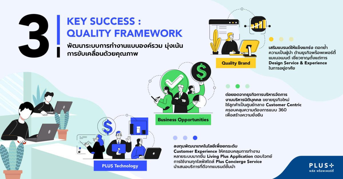 1. Quality Brand เสริมแบรนด์ให้แข็งแกร่ง ตอกย้ำความเป็นผู้นำด้านธุรกิจพร็อพเพอร์ตี้ แมเนจเมนต์ ด้วยประสบการณ์ในการทำงานกับลูกบ้านอย่างใกล้ชิดมีการเก็บข้อมูลมาวิเคราะห์ทำให้เข้าใจถึงความต้องการอย่างลึกซึ้ง โดยเฉพาะกลุ่มลูกค้าระดับ Luxuryที่เข้าใจใน Customer Journey เพิ่มศักยภาพทุกจุด Touch Point ในการบริการ สร้างประสบการณ์พิเศษเหนือระดับในทุกขั้นตอน พิถีพิถันการคัดเลือกบุคลากร พร้อมจัดอบรมและตรวจสอบคุณภาพการทำงานอย่างเข้มข้นอย่างสม่ำเสมอโดยสถาบัน PLUS Eduplex มีการยกระดับมาตรฐานงานบริการให้กับหลายโครงการ มีทีมผู้เชี่ยวชาญตั้งแต่การ Design Service & Experience ในการอยู่อาศัย รองรับความต้องการแบบ Specialise Service พลัสฯ เข้าใจดีว่าหัวใจสำคัญของธุรกิจบริการ คือ การรักษามาตรฐานการบริการให้ได้ระดับสากล พลัสฯ มุ่งมั่นรักษาความเป็นที่หนึ่งด้านคุณภาพ ยกระดับมาตรฐานของการบริการ เพิ่มประสิทธิภาพการทำงานที่ดีขึ้น ช่วยลดต้นทุนที่ไม่จำเป็นให้ลดลง สร้างมูลค่าเพิ่มให้กับโครงการ และสร้างความพึงพอใจให้กับลูกค้า ทำให้ลูกค้าให้ความไว้วางใจอย่างต่อเนื่องมากกว่า 90%