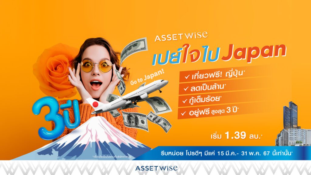 ‘แอสเซทไวส์’ ยกทัพคอนโดมิเนียมคุณภาพหลากทำเลกว่า 20 โครงการ ทั้งพร้อมอยู่ และโปรเจกต์ใหม่ จัดแคมเปญเด็ดต้อนรับซัมเมอร์เอาใจลูกค้าคนรุ่นใหม่สายท่องเที่ยว กับ “AssetWise เปย์ใจ ไป Japan” จองและทำสัญญา รับทันทีแบบไม่ต้องลุ้นกับแพ็คเกจบินลัดฟ้าเที่ยวประเทศญี่ปุ่น 4 วัน 3 คืน* พร้อมข้อเสนอสุดพิเศษ และส่วนลดแบบปังๆ สูงสุดถึง 1 ล้านบาท* ตั้งแต่วันนี้ – 31 พฤษภาคม 67 เท่านั้น