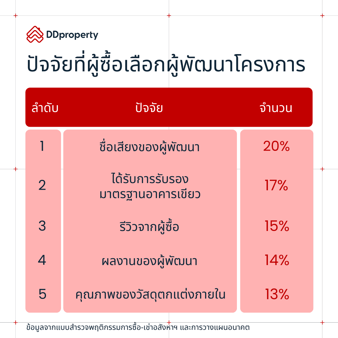 ปัจจุบันเทรนด์รักษ์โลกมีผลต่อการตัดสินใจซื้อที่อยู่อาศัยของผู้บริโภคมากขึ้น เห็นได้ชัดจากข้อมูลจากแบบสำรวจพฤติกรรมการซื้อ-เช่าอสังหาฯ และการวางแผนอนาคตของดีดีพร็อพเพอร์ตี้ (DDproperty) แพลตฟอร์มอสังหาริมทรัพย์อันดับ 1 ของไทย พบว่า 17% ของผู้ตอบแบบสอบถามฯ ตัดสินใจเลือกผู้พัฒนาอสังหาฯ ที่มีชื่อเสียงด้านโครงการที่ได้รับการรับรองมาตรฐานอาคารเขียว หรือปฏิบัติตามแนวทางความยั่งยืนในการก่อสร้างมาเป็นอันดับ 2 รองมาจากการเลือกจากชื่อเสียงของผู้พัฒนาอสังหาฯ (20%)