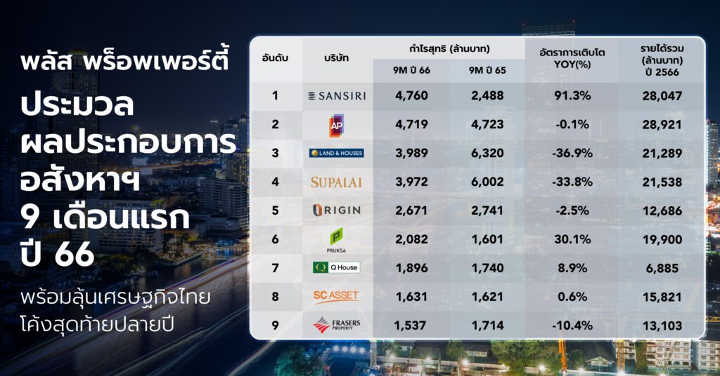 สำหรับผู้ประกอบการอสังหาฯมีการเผยตัวเลขกำไรสุทธิ 9 เดือนแรก พบว่า แสนสิริ กำไรสุทธิ 4,760 ล้านบาท ครองแชมป์อันดับ 1.โตสูงถึง 91.3% ตามมาด้วยอันดับ 2.เอพี ไทยแลนด์ กำไรสุทธิ 4,719 ล้านบาท กำไรลดลง 0.1% 3.แลนด์แอนด์เฮ้าส์ กำไรสุทธิ 3,989 ล้านบาท กำไรลดลง 36.9% 4.ศุภาลัย กำไรสุทธิ 3,972ล้านบาท กำไรลดลง 33.8% 5.ออริจิน กำไรสุทธิ 2,671 ล้านบาท กำไรลดลง 2.5% 6.พฤกษา กำไรสุทธิ 2,082 ล้านบาท โต 30.1% 7.คิวเฮ้าส์ กำไรสุทธิ 1,896 ล้านบาท โต 8.9% 8.เอสซี แอสเสท กำไรสุทธิ 1,631 ล้านบาท โต 0.6% และ9.เฟรเซอร์ส กำไรสุทธิ 1,537 ล้านบาท กำไรลดลง 10.4% ตามลำดับทำให้ภาพรวมในไตรมาสที่ 3 มีบางบริษัทที่โตขึ้นและบางบริษัทลดลงเล็กน้อยจากปี 2565