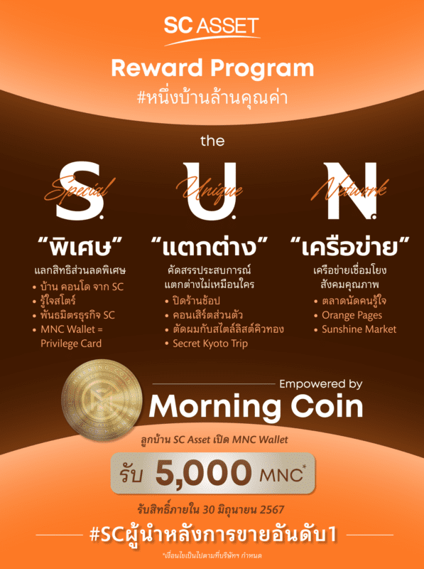 นายณัฐพงศ์ คุณากรวงศ์ ประธานเจ้าหน้าที่บริหาร บริษัท เอสซี แอสเสท คอร์ปอเรชั่น จำกัด (มหาชน) หรือ SC ผู้นำอสังหาริมทรัพย์คุณภาพและมีนวัตกรรม กล่าวว่า “SC มุ่งสร้างคุณค่าและคุณภาพชีวิตที่ดีให้ลูกบ้าน ด้วยนวัตกรรมที่ทันสมัย ตามแนวคิด #หนึ่งบ้านล้านคุณค่า ที่เชื่อว่าการลงทุนที่อยู่อาศัยนอกจากจะได้บ้านและคอนโดแล้ว ยังควรได้คุณภาพชีวิตที่ดีจากการได้สิทธิประโยชน์ต่างๆ อีกด้วย จึงเป็นที่มาของการเปิดตัว “มอร์นิง คอยน์” (Morning Coin – MNC) ที่มีการนำเทคโนโลยีบล็อกเชนที่จะเชื่อมโยงลูกบ้านสู่โลกแห่งสิทธิพิเศษมากมาย ภายใต้ SC Asset Reward Program “The S.U.N.” ประกอบด้วย