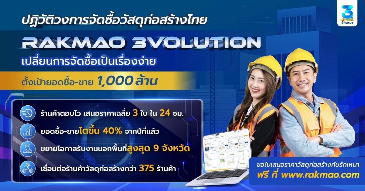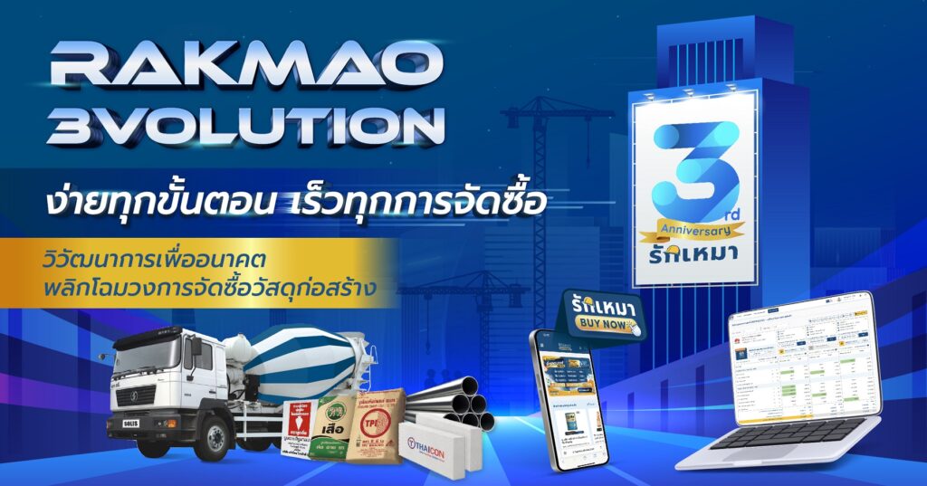 แพลตฟอร์มรักเหมา (www.rakmao.com) แพลตฟอร์มจัดซื้อวัสดุก่อสร้างออนไลน์ชั้นนำของไทย เดินเกมรุกกระตุ้นยอดส่งท้ายปี’67 ฉลองครบรอบ 3 ปี ด้วยแคมเปญสุดพิเศษ “รักเหมา 3Volution” มุ่งเน้นการพัฒนาโซลูชันและนวัตกรรม ภายใต้แนวคิด “วิวัฒนาการเพื่ออนาคต“ ปฏิวัติวงการจัดซื้อวัสดุก่อสร้างไทย ตั้งเป้าสิ้นปีกวาดยอดซื้อ-ขายผ่านแพลตฟอร์ม (GMV) กว่า 1,000 ล้านบาท มีการเติบโตสูงถึง 40%