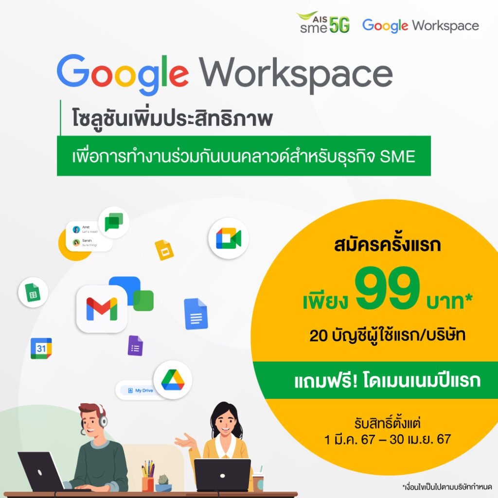 สำหรับผู้ประกอบการขนาดกลางและขนาดย่อย หรือ SME สามารถใช้บริการ Google Workspace แบบเต็มรูปแบบกับ AIS SME ได้ในราคาพิเศษเริ่มต้น 99 บาทเท่านั้น พร้อมรับโปรโมชันพิเศษ แถมฟรี Domain Name ปีแรก