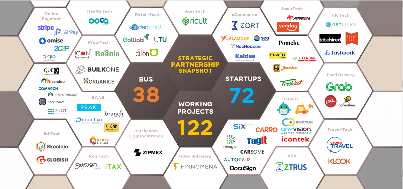 แซม เล่าต่อว่า ‘นอกจากเรื่องของการจัดตั้งกองทุนแล้ว ยังมีในส่วนของการทำโปรเจกต์ความร่วมมือระหว่างกรุงศรีกรุ๊ป กับสตาร์ทอัพด้วย ซึ่งปัจจุบันมีหน่วยงานในกรุงศรีกรุ๊ปถึง 38 หน่วยงานแล้วที่ได้ร่วมทำงานกับสตาร์ทอัพ โดยมีทีมกรุงศรี ฟินโนเวต เป็นผู้นำเสนอและจับคู่ให้ ในปัจจุบันหน่วยงานต่างๆ เองเล็งเห็นว่าการทำงานที่เกี่ยวข้องกับเทคโนโลยีนั้น หากจะกระโดดมาลงมือทำเองต้องใช้ทั้งเวลาและต้นทุนที่สูงมาก ซึ่งกลับกันหากเลือกทำงานร่วมกับสตาร์ทอัพ ก็จะช่วยลดทอนในเรื่องของทั้งต้นทุนและเวลา ซึ่งอาจจะใช้เวลาเพียง 3-6 เดือน ก็สามารถเริ่มโปรเจ็คใหม่ หรือโซลูชั่นใหม่ได้แล้ว ขณะที่สตาร์ทอัพเองก็มี Mindset พร้อมลุย พร้อมที่จะต่อยอด ปัจจัยเหล่านี้จึงเป็นที่มาของความสำเร็จในวันนี้ ที่เราได้ทำงานร่วมกับสตาร์ทอัพมากมายกว่า 72 บริษัท กับอีก 122 โปรเจกต์ เรียกได้ว่าเราทำงานกับสตาร์ทอัพมากที่สุดในภูมิภาคเอเชียตะวันออกเฉียงใต้ ซึ่งถือว่าเป็นอีกหนึ่งความภูมิใจของทีมงาน Krungsri Finnovate’