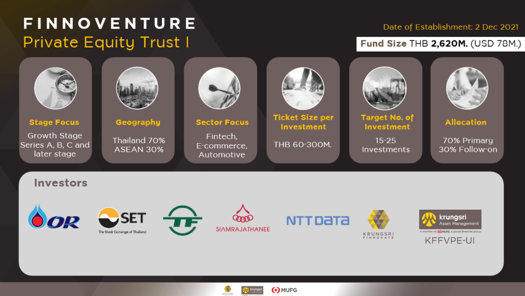 - บริษัทฯ ได้ตั้ง Finnoventure Private Equity Trust 1 กองทุนมูลค่า 3,000 ล้านบาท กองแรกในไทยที่มุ่งลงทุนในสตาร์ทอัพและเปิดให้นักลงทุนรายบุคคล (UI) ได้ร่วมลงทุน
