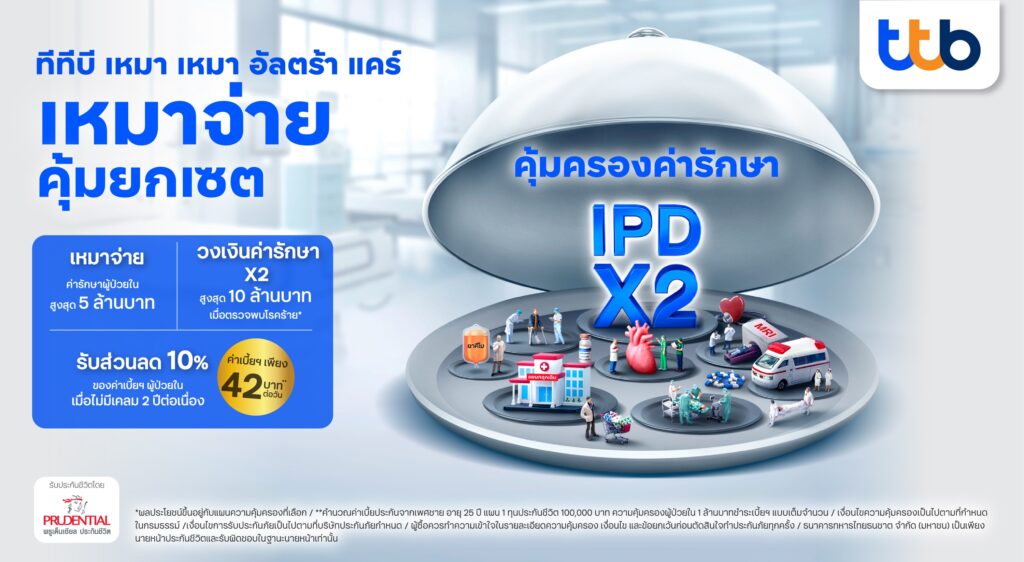 ทีเอ็มบีธนชาต หรือ ทีทีบี มุ่งต่อยอดรูปแบบประกันชีวิตและประกันสุขภาพให้ครอบคลุมความต้องการของลูกค้าทุกกลุ่มได้มากขึ้น พร้อมจับมือพันธมิตรทางธุรกิจ พรูเด็นเชียล ประเทศไทย เปิดตัวผลิตภัณฑ์ “ประกันชีวิตและสุขภาพ ทีทีบี เหมา เหมา อัลตร้า แคร์” ออกแบบมาเพื่อดูแลลูกค้าแบบเหมา ๆ ในทุกช่วงเวลา เหมาจ่ายค่ารักษาพยาบาลผู้ป่วยใน สูงสุดถึง 5 ล้านบาท หากตรวจพบโรคร้ายแรง* วงเงินความคุ้มครองผู้ป่วยในจะเพิ่มเป็น 2 เท่า เพื่อดูแลค่ารักษาสุขภาพกาย และพิเศษเพิ่มการดูแลค่ารักษาสุขภาพใจให้กับทั้งตัวลูกค้าและบุคคลในครอบครัว นอกจากนี้หากไม่มีเคลม 2 ปีต่อเนื่อง รับส่วนลดเบี้ยฯ ผู้ป่วยใน 10% ในปีถัดไป จ่ายค่าเบี้ยประกันภัยสุดคุ้มเพียง 42 บาท/วัน** เพื่อช่วยลูกค้าวางแผนการใช้จ่ายได้อย่างคุ้มค่า และสร้างชีวิตทางการเงินที่ดีขึ้นทั้งวันนี้และอนาคต