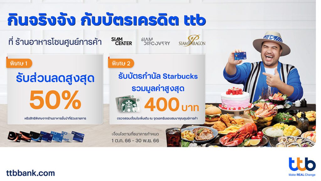 บัตรเครดิต ttb ชวนกินจริงจัง มอบส่วนลดสูงสุด 50% พร้อมบัตรกำนัล Starbucks ที่ ร้านอาหารดังโซนศูนย์การค้า Siam Center, Siam Discovery และ Siam Paragon