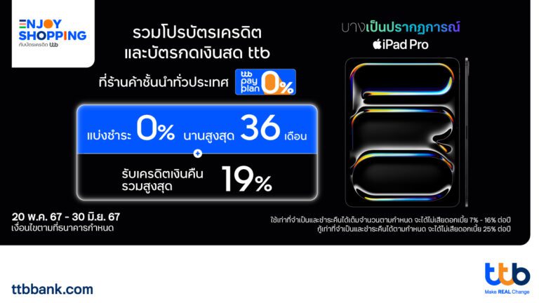 บัตรเครดิต และบัตรกดเงินสด ttb มอบสิทธิ์สุดคุ้มเมื่อซื้อ iPad Pro และ iPad Air แบ่งชำระ 0% นานสูงสุด 36 เดือน และรับเครดิตเงินคืนรวมสูงสุด 19%