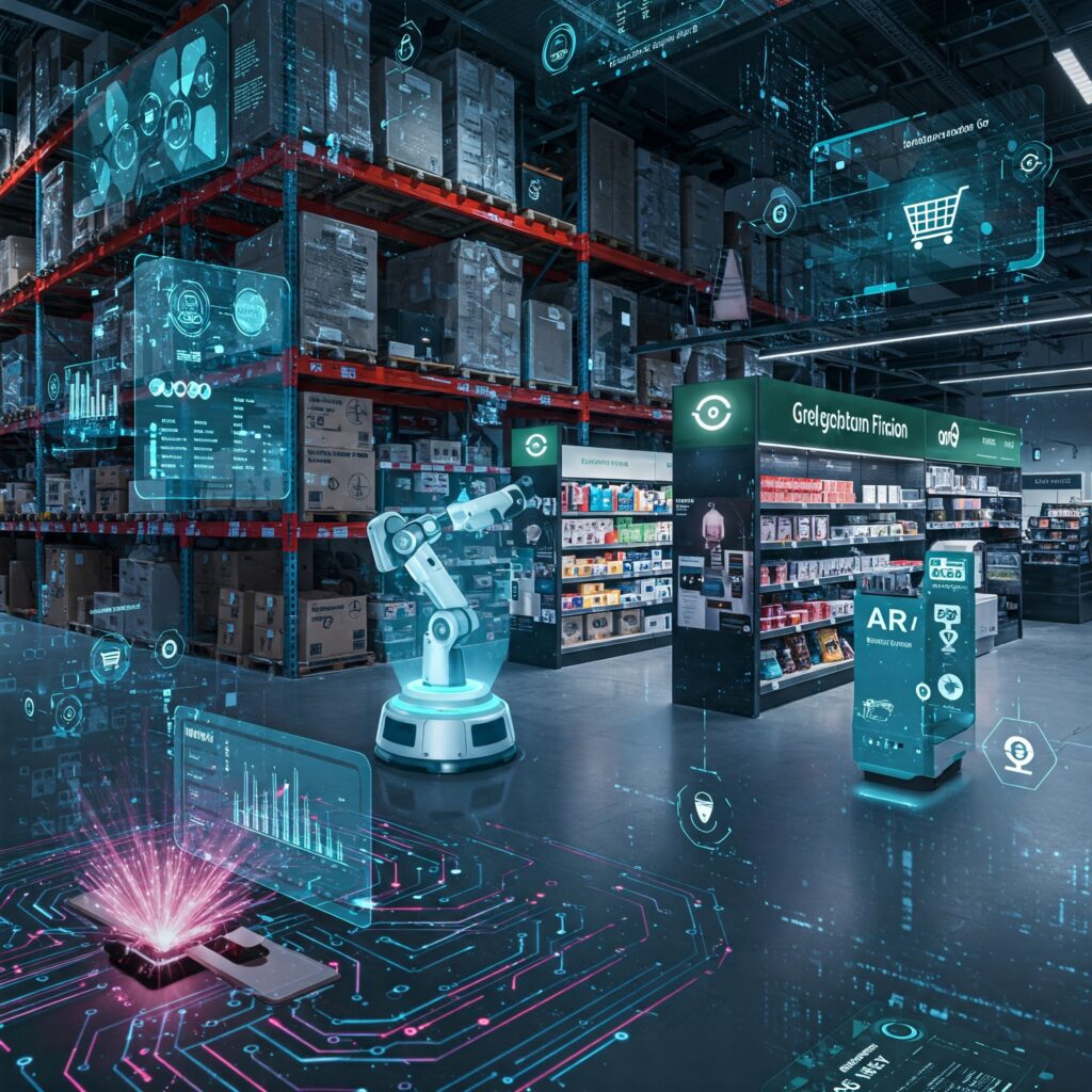 โลจิสติกส์อัจฉริยะ และการส่งสินค้าแบบใหม่ เริ่มจาก AI Warehouse + หุ่นยนต์คลังสินค้า โดยคลังสินค้าจะถูกควบคุมโดย AI + หุ่นยนต์อัตโนมัติ, หุ่นยนต์สามารถจัดเรียงสินค้า เร็วกว่ามนุษย์ 10 เท่า และลดความผิดพลาด การจัดส่งแบบ Hyper-Fast ภายใน 1 ชั่วโมง AI Drones และหุ่นยนต์ส่งของ จะช่วยให้การส่งสินค้าเร็วขึ้น, ระบบ AI สามารถคำนวณเส้นทางที่เร็วที่สุดโดยอิงจากสภาพอากาศและการจราจร, Smart Packaging & Circular Economy AI จะช่วยให้บรรจุภัณฑ์ปรับแต่งได้ตามสภาพอากาศ หรือรีไซเคิลได้ง่ายขึ้น การช้อปปิ้งอนาคตจะใช้ บรรจุภัณฑ์ที่คืนกลับไปรีไซเคิลอัตโนมัติ เพื่อลดขยะ