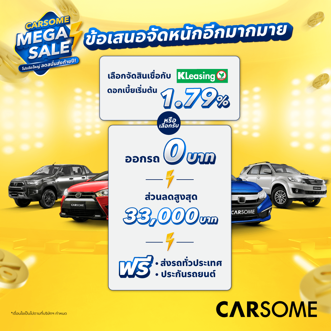 CARSOME แพลตฟอร์มอีคอมเมิร์ซซื้อขายรถยนต์มือสองครบวงจรที่ใหญ่ที่สุดในเอเชียตะวันออกเฉียงใต้ เปิดตัวแคมเปญ “CARSOME Mega Sale” มอบโปรโมชันสุดพิเศษส่งท้ายปี เอาใจลูกค้าที่กำลังมองหารถยนต์มือสองคุณภาพดี ให้เป็นเจ้าของรถได้ง่ายและสะดวกกว่าที่เคย พร้อมสิทธิพิเศษมากมาย ทั้งอัตราดอกเบี้ยเริ่มต้นที่ 1.79% จากลีสซิ่งกสิกรไทย และมีสิทธิ์เป็นผู้โชคดีรับรางวัลทองคำเมื่อซื้อรถยนต์กับ CARSOME ตั้งแต่วันที่ 16 พฤศจิกายน – 29 ธันวาคม 2565 นี้