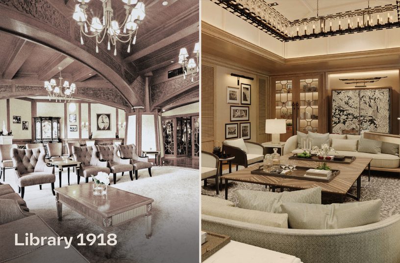 ก่อนที่จะมาเป็น ห้องไลบรารี่ นั้น ห้องนี้เคยเป็นห้องอาหารอิตาเลียน และห้องจัดเลี้ยงนํ้าชาที่จัดถวายเป็นพระบรมราชานุสรณ์ ในรัชกาลที่ 6 ภายหลังเมื่อได้ปรับมาเป็นห้องประชุมจึงได้ออกแบบให้ภายในห้องตกแต่งด้วยหัตถศิลป์งานฉลุไม้ที่สง่างามประดับตกแต่งด้วยพระบรมฉายาลักษณ์ และมีข้าวของเครื่องใช้ในองค์รัชกาลที่ 6 ซึ่งของสะสมต่างๆ เหล่านี้ถือเป็นการเทิดพระเกียรติองค์รัชกาลที่ 6 ในฐานะผู้สร้างเมืองจำลองดุสิตธานีขึ้น เพื่อใช้ทดลองการปกครองระบอบประชาธิปไตยในปี พ.ศ. 2461 (ค.ศ. 1918) ห้องดังกล่าวได้ถูกใช้สำหรับการจัดงานขนาดเล็กในโอกาสต่างๆ อาทิ พิธีหมั้นแบบไทย การจัดเลี้ยงรับรองเป็นการส่วนพระองค์แก่ราชวงศ์ และบุคคลสำคัญชั้นนำทั้งจากไทยและต่างประเทศ