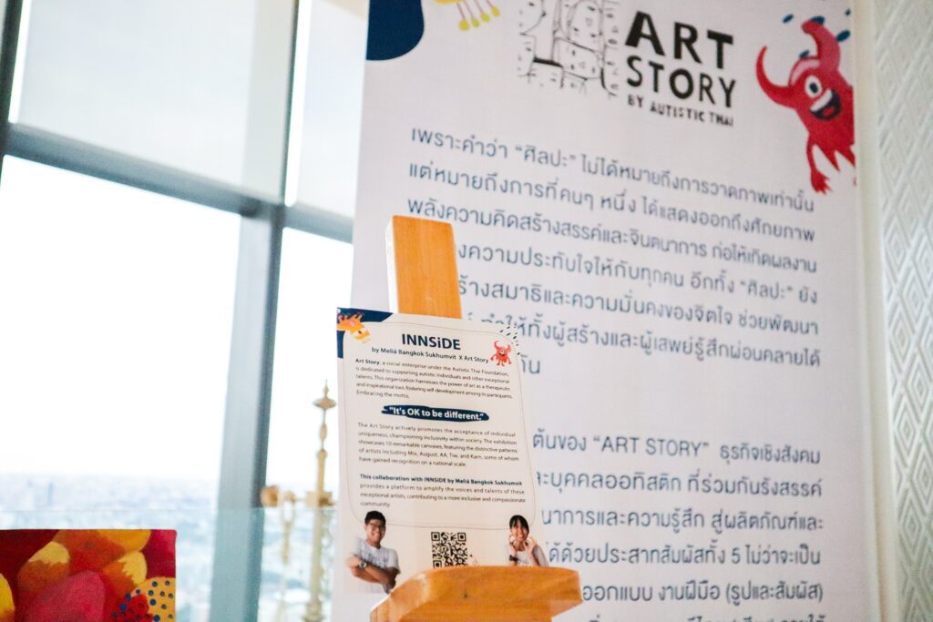 ภายใต้การดูแลของมูลนิธิออทิสติก โครงการ ‘Art Story’ ใช้ศิลปะเป็นเครื่องมือในการบำบัดและสร้างแรงบันดาลใจ เพื่อส่งเสริมให้ศิลปินได้พัฒนาตนเอง และช่วยส่งเสริมความพิเศษของแต่ละคนให้กลายเป็นจุดแข็ง อีกทั้ง มูลนิธิยังมีเป้าหมายเพื่อสร้างสภาพแวดล้อมที่สามารถรองรับและสนับสนุนบุคคลที่อาจมีความต้องการหรือความสามารถที่แตกต่างจากคนทั่วไป โดยโรงแรมอินน์ไซด์ บาย มีเลีย กรุงเทพ สุขุมวิท จะสนับสนุน อีกทั้งช่วยระดมทุนสำหรับมูลนิธิ ผ่านการใช้รหัส QR ที่อยู่ข้างงานศิลปะแต่ละชิ้น ซึ่งผู้เข้าชมที่ต้องการเป็นเจ้าของภาพวาดหรือผลิตภัณฑ์ที่ได้รับแรงบันดาลใจต่อยอดจากภาพวาดเหล่านี้ สามารถจับจองผลงานโดยสแกนรหัส QR เพื่อชำระเงินไปยังมูลนิธิโดยตรง