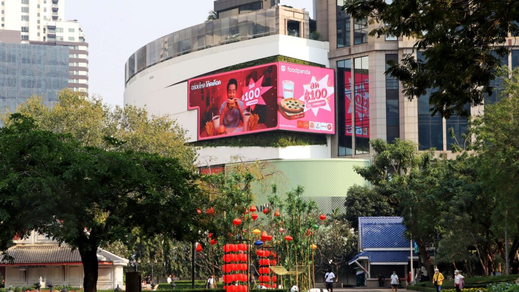 สำหรับการสื่อสารในแคมเปญ “อร่อยโหด โค้ดเดือด” ที่ foodpanda เน้นสร้างการรับรู้ทั่วไทย ผ่านสื่อออนไลน์ สื่อ Out of Home และ Digital Out of Home ในย่านศูนยกลางทางธุรกิจในกรุงเทพฯ อย่างย่าน Em District ซึ่งคาดว่าจะสามารถสร้างการมองเห็นกับกลุ่มเป้าหมายได้ถึง 18 ล้าน Reach ในช่วงเวลา 1 เดือน นอกจากนี้ยังใช้สื่อ Out of Home ในพื้นที่เป้าหมายในจังหวัดต่าง ๆ ทั่วไทย โดยเฉพาะโซนภาคใต้อย่างภูเก็ต และสุราษฎร์ธานี ซึ่งคาดว่าจะสามารถสร้างการมองเห็นกับกลุ่มเป้าหมายได้มากถึง 20 ล้าน Reach ในช่วงเวลา 1 เดือน ด้วยเช่นกัน รูปแบบของสื่อ Out of Home และ Digital Out of Home ในแคมเปญนี้ มีความโดดเด่นด้วยสีประจำของ foodpanda ที่เป็นสีชมพูสดใส สร้างความแตกต่างจากคู่แข่งในตลาด ทั้งยังจดจำได้ง่าย แสดงออกถึงความสุขและความสนุกสนานที่มาพร้อมส่วนลด และภาพอาหารชัด ๆ ใหญ่ ๆ ชวนหิว ตอกย้ำภาพจำแคมเปญ “อร่อยโหด โค้ดเดือด”