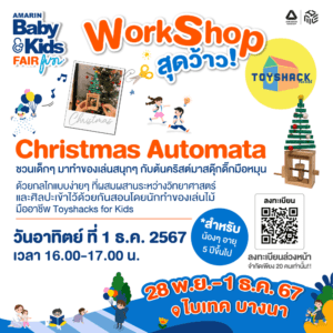 - Workshop สุดว้าว ชวนเด็ก ๆ มาทำของเล่นสนุกๆ กับต้นคริสต์มาสดุ๊กดิ๊กมือหมุน ด้วยกลไกแบบง่ายๆ ที่ผสมผสานระหว่างวิทยาศาสตร์กับศิลปะเข้าไว้ด้วยกัน สอนโดยนักทำของเล่นไม้มืออาชีพ Toyshacks for kids