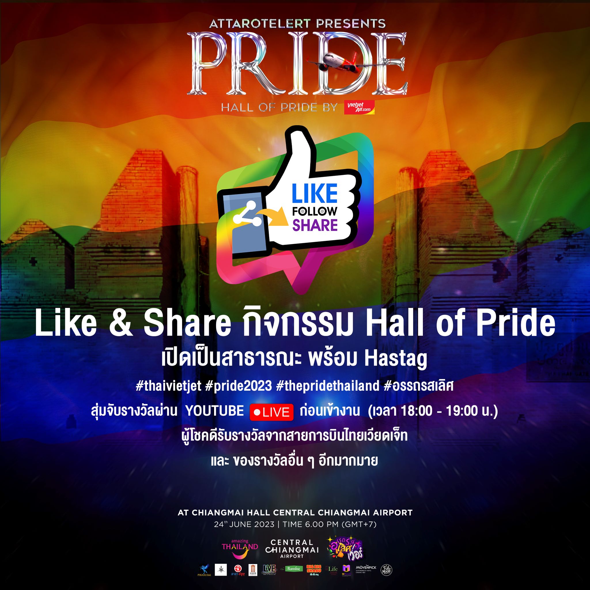 นอกจากนี้ มีกิจกรรมก่อนวันงานให้ผู้เข้าร่วมได้สนุกและลุ้นรับรางวัลมากมาย อาทิ กิจกรรม “Wanna be on Pride” เปิดโอกาสผู้เข้าร่วมส่งภาพถ่ายในเครื่องแต่งกายสุดเก๋ แชร์ภาพดังกล่าวลงบนโซเชียลมีเดียพร้อมคำบรรยายภาพที่สร้างสรรค์ โดยผลงานที่มียอดไลค์ แชร์ และแสดงความคิดเห็นมากที่สุดจะได้รับรางวัลบัตรกำนัลบัตรโดยสารจากไทยเวียตเจ็ทสำหรับเส้นทาง เชียงใหม่ – โอซาก้า รวมถึงกิจกรรม “Tiktok Lip Sync Contest” เปิดโอกาสให้ผู้เข้าร่วมแสดงทักษะการลิปซิงค์ในเพลงที่กำหนด โดยผลงานที่มียอดไลค์ แชร์ และแสดงความคิดเห็นมากที่สุดจะได้รับรางวัลพิเศษ ปิดท้ายด้วยกิจกรรม “LIKE & SHARE Hall of Pride” เพียงไลค์และแชร์โพสต์กิจกรรม “Hall of Pride” ผู้โชคดีจากการสุ่มจะได้รับรางวัลพิเศษจากสายการบินไทยเวียตเจ็ท
