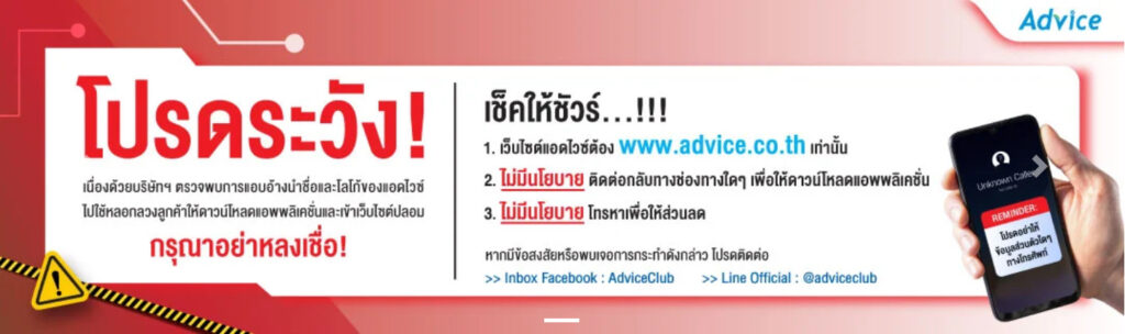 • เว็บไซต์ทางการของแอดไวซ์คือ www.advice.co.th เท่านั้น เน้น co.th
