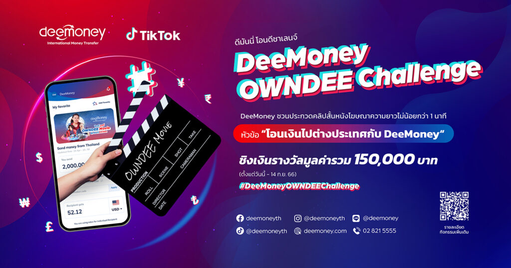 โดยผู้สนใจสามารถส่งคลิปผลงานหนังโฆษณาความยาวไม่เกิน 1 นาที ที่สร้างสรรค์ตามแบบฉบับของตนเองภายใต้โจทย์ของ DeeMoney ใน #DeeMoneyOWNDEEChallenge และโพสต์ลงในช่องทาง TikTok ของตนเอง เปิดเป็นสาธารณะ พร้อมติด #DeeMoneyOWNDEEChallenge #DeeMoney #โอนเงินจากไทยไปต่างประเทศ #OWNDEE ได้ตั้งแต่วันนี้ จนถึงวันที่ 14 กันยายน 2566 โดยสามารถดูรายละเอียดเพิ่มเติมได้ที่ website: https://bit.ly/TikTokOWNDEE หรือสอบถามรายละเอียดเพิ่มเติมที่ Line OA: @deemoney (https://lin.ee/B22ZCCS) ห้ามพลาดกับโอกาสครั้งสำคัญในการร่วมสนุก ชิงเงินรางวัลรวม 150,000 บาท จาก DeeMoney ผู้ให้บริการโอนเงินไปต่างประเทศ