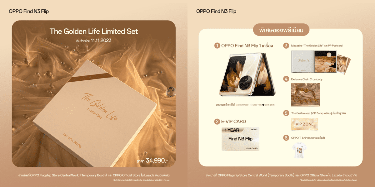 โดยในคอลเลกชันสุดพิเศษนี้ The Golden Life Limited Set ความเรียบหรูที่คุณสัมผัสได้ ได้มาพร้อมกับของลิมิเต็ดสุดพรีเมียม 6 อย่าง ได้แก่ OPPO Find N3 Flip 1 เครื่อง (สามารถเลือกสีได้) , E-VIP Card , OPPO T-Shirt (คละลายและไซส์), นิตยสาร “The Golden Life” พร้อมโปสการ์ด PP สุดพิเศษ , Exclusive Chain Crossbody, The Golden Seat (VIP Zone) รับสิทธิเข้างาน OPPO Flip Fan Fest พร้อมลุ้นโชคสุดฟินในงานอีกมากมาย