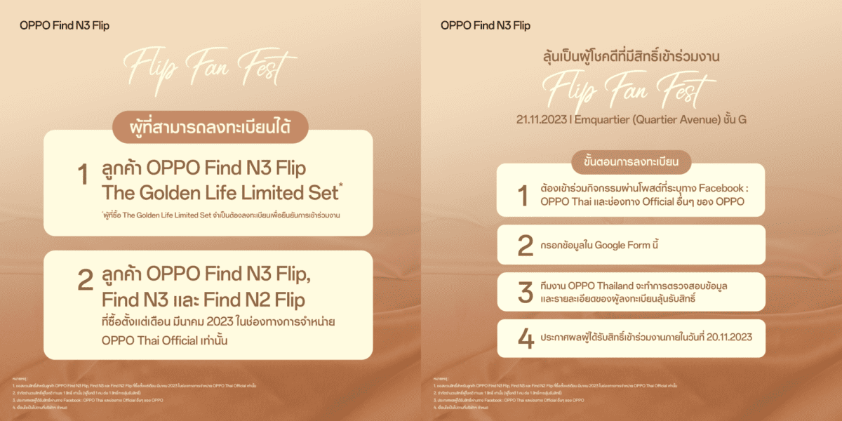 * ขอสงวนสิทธิ์สำหรับลูกค้า OPPO Find N3 Flip ‘The Golden Life Limited Set’ และลูกค้า OPPO Find N3 Flip, Find N3, Find N2 Flip ที่ซื้อตั้งแต่เดือน มีนาคม 2023 ในช่องทางการจำหน่าย OPPO Thai Official เท่านั้น