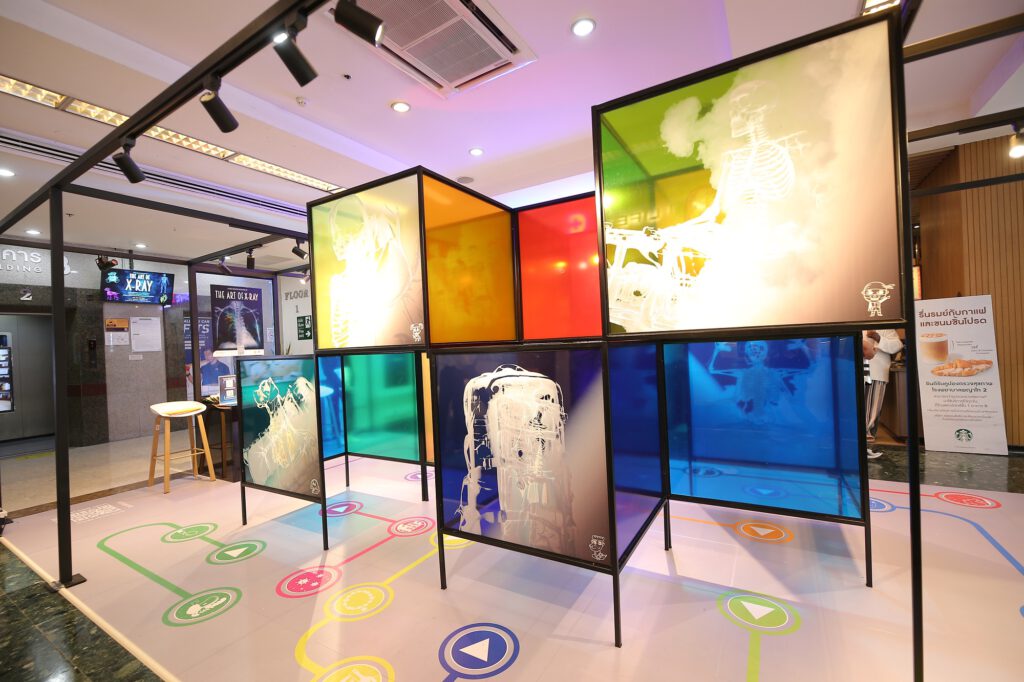 ภายในงาน “THE ART OF X – RAY” ได้จัดแสดงผลงานและนวัตกรรม AIเพื่อการดูแลสุขภาพในมิติใหม่ โดยสื่อสารผ่าน 10 ตัวละครที่มีพฤติกรรมและอาการเจ็บป่วยที่แตกต่างกัน พร้อมแสดงผลตรวจจำลองจากโปรแกรม AI Chest (Artificial Intelligence for chest) ออกมาเป็นภาพถ่ายจากรังสีเอกซ์ ที่จะไฮไลท์จุดที่ควรเฝ้าระวัง เช่น บริเวณที่มีความผิดปกติมากและควรเฝ้าระวัง จะมีสีแดง และไล่เรียงตามเฉดสีโทนเย็นไปถึงโทนร้อน