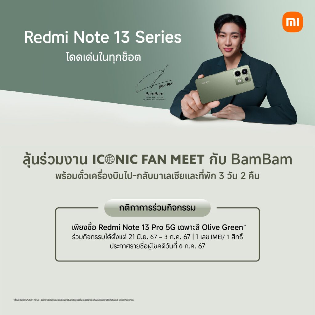 Home » เสียวหมี่มอบสิทธิพิเศษให้ลูกค้าที่ซื้อ Redmi Note 13 Pro 5G สีใหม่ Olive Green ลุ้นร่วมงาน ICONIC FAN MEET กับ BamBam ที่ประเทศมาเลเซีย