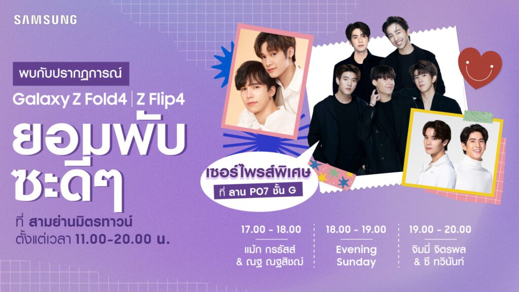 Samsung Galaxy Z Fold4 I Z Flip4 ชวนมาพับซะดีๆ กับนักร้องนักแสดงวัยรุ่นสุดป๊อป แม้กกรธัสส์ และณฐณฐสิชฌ์, วง Evening Sunday, จิมมี่จิตรพล และซีทวินันท์