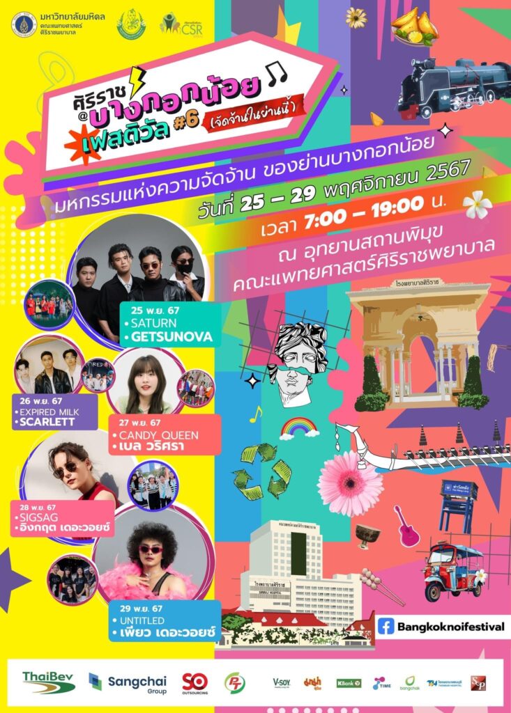 คณะแพทยศาสตร์ศิริราชพยาบาล มหาวิทยาลัยมหิดล ขอเชิญชวนประชาชนและผู้สนใจเข้าร่วมงานเฟสติวัลสุดยิ่งใหญ่ “ศิริราช @บางกอกน้อยเฟสติวัล ครั้งที่ 6” (จัดจ้านในย่านนี้) พบความสนุกครบทุกรสรวมมาในที่เดียวกับกิจกรรมไฮไลท์ 4 ย่านด้วยกัน ได้แก่