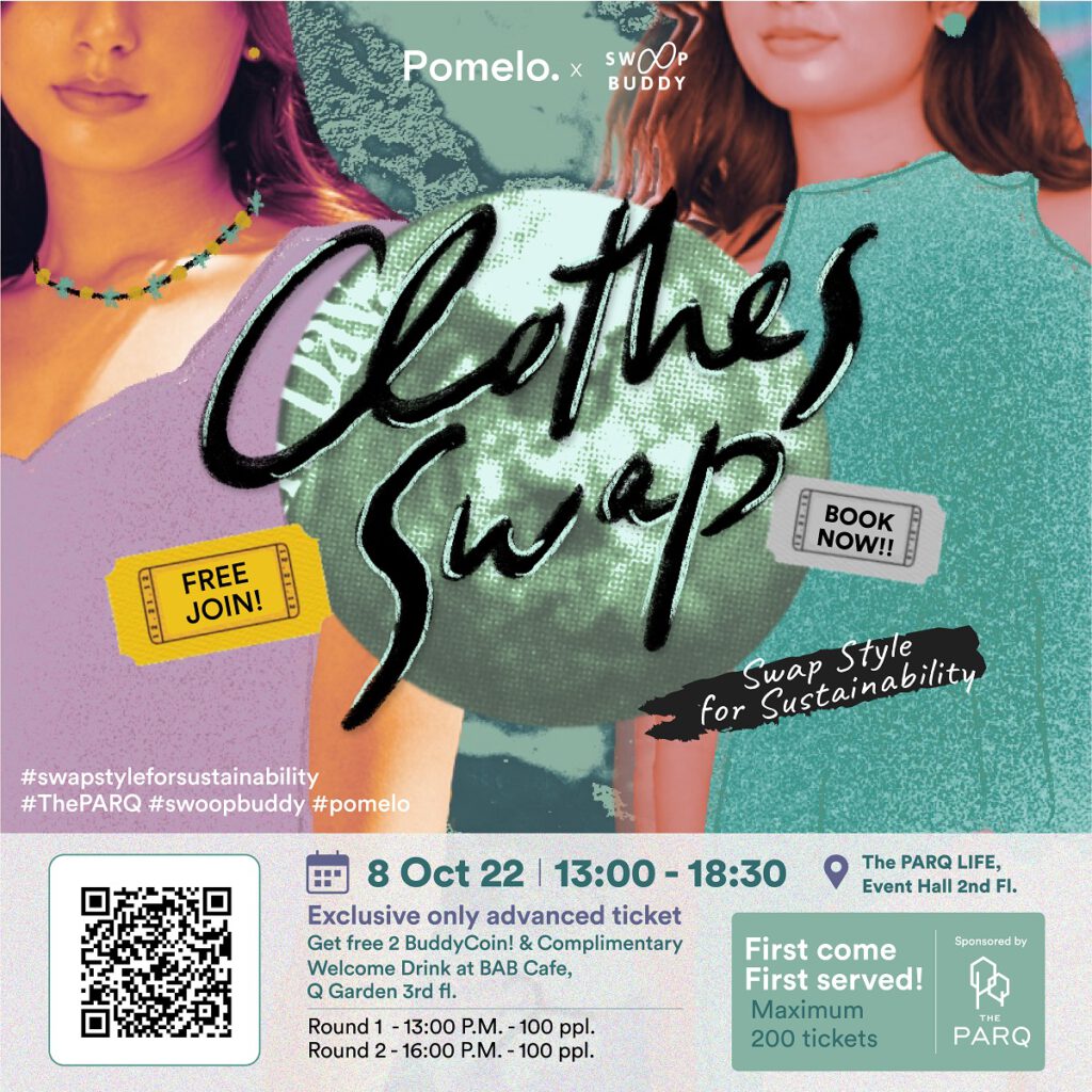 ครั้งแรกกับการจัดกิจกรรมแลกเปลี่ยนเสื้อผ้าสำหรับ #PomeloGirls เพื่อต่ออายุเสื้อผ้าและเปิดโลกการช้อปปิ้งแบบยั่งยืน Pomelo จับมือ Swoop Buddy จัดงาน ‘Swap Styles for Sustainability’ Clothes Swap ในวันเสาร์ที่ 8 ตุลาคม 2565 ที่ The PARQ Life บริเวณ Event Hall ชั้น 2 ตั้งแต่เวลา 13.00 – 18.30 น. ห้ามพลาด! ร่วมสนุกกับการแลกเปลี่ยนเสื้อผ้าพร้อมช้อปสไตล์ใหม่ ๆ อย่างยั่งยืน