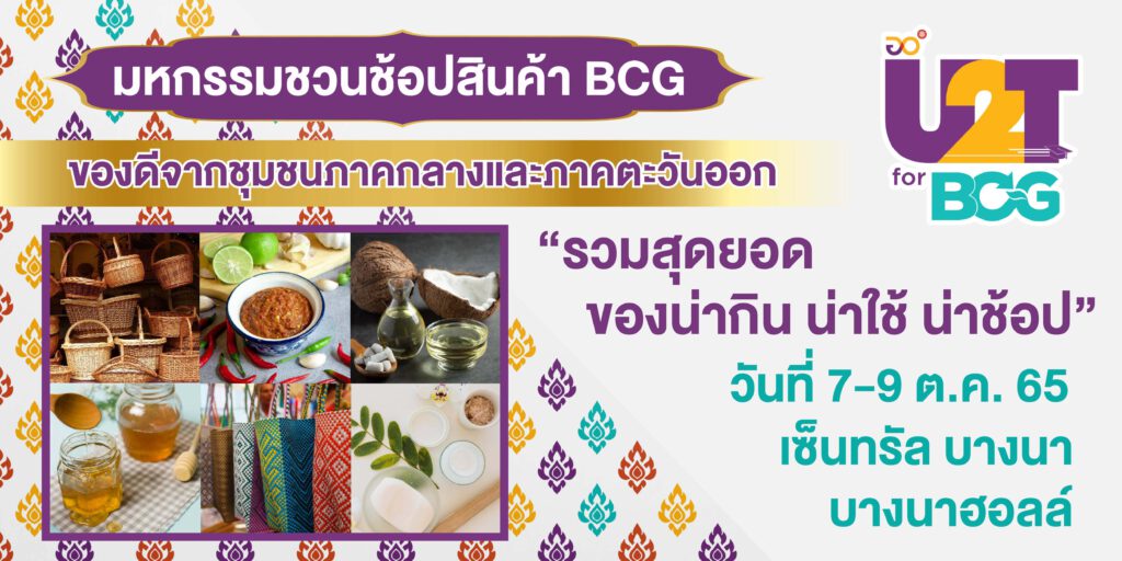 กระทรวงการอุดมศึกษาวิทยาศาสตร์วิจัยและนวัตกรรม จัดงาน “U2T for BCG Fair” เพื่อสนับสนุนสินค้าของชุมชน ที่ได้รับการสร้างสรรค์ พัฒนาคุณภาพ จากนักศึกษาและศิษย์เก่าที่เข้าร่วมโครงการ U2T for BCG 2565 นำสินค้ามาจัดแสดงและจำหน่ายร่วม 100 บูธ เพื่อสร้างการรับรู้ประชาสัมพันธ์โครงการและสนับสนุนการสร้างรายได้ให้กับชุมชน เพื่อเป็นการยกระดับคุณภาพสินค้าประจำตำบลทั่วประเทศอย่างยั่งยืน นอกจากช่วยชุมชนแล้ว ยังได้ช้อปสนุกไปกับสินค้านวัตกรรมสุดล้ำ อาทิ อาหารจากวัตถุดิบท้องถิ่น ผงปรุงรสจากธรรมชาติด้วยเทคโนโลยีทันสมัย ผลิตภัณฑ์เพื่อสุขภาพและความงามจากธรรมชาติ งานสานฝีมือสุดประณีตมาผลิตเป็นของใช้และแฟชั่นสุดโมเดิลที่มีชิ้นเดียวในโลก พร้อมชมการแสดงท้องถิ่นและฟังเสวนาวิชาการจากผู้พัฒนาผลิตภัณฑ์เกี่ยวกับ BCG ในมุมมองใหม่ที่น่าสนใจ จัดเต็มมาให้ทั้งความรู้และเอาใจ นักช้อปตลอด 3 วันเต็ม พบกัน 7-9 ตุลาคม 2565 ณ เซ็นทรัล บางนาฮอลล์ ชั้น B1