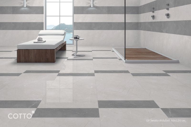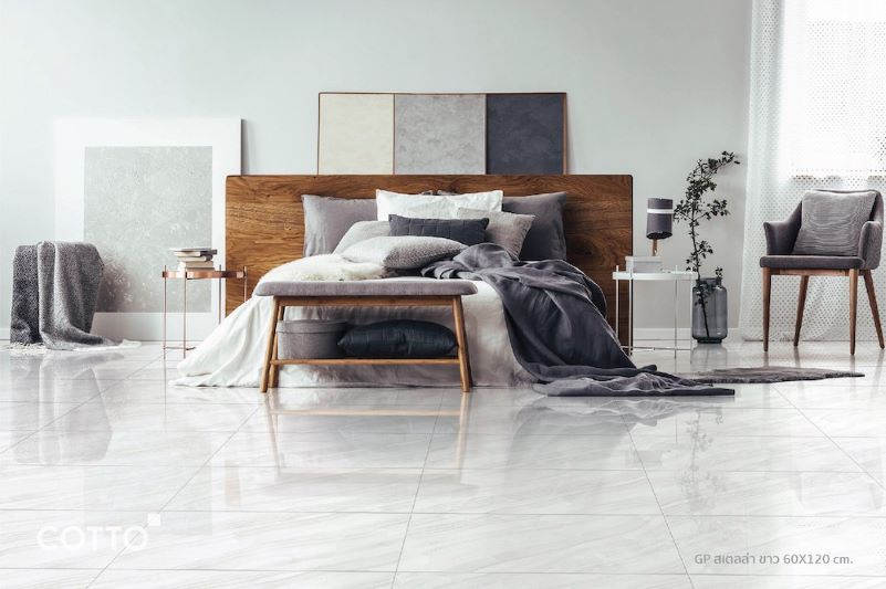 ห้องนอนเป็นหนึ่งในพื้นที่บ้านที่ต้องการความเงียบสงบ เรียบง่ายแบบไร้รอยต่อ การเลือกใช้วัสดุปูพื้นด้วยกระเบื้องพอร์ชเลนชนิดตัดขอบ แผ่นใหญ่ขนาด 60×120 cm. ควรเลือกใช้กาวซีเมนต์ คอตโต้ (เทา) ที่มีเนื้อกาวเหนียว ดูดซึมน้ำต่ำ ป้องกันความชื้น พลังยึดเกาะสูง ลดการหลุดล่อน ใช้ได้ทั้งภายในและภายนอกอาคาร และกาวยาแนว คอตโต้ สลิมพลัส ด้วยคุณสมบัติของกาวที่มีการไหลตัวดีสามารถเติมเต็มร่องกระเบื้องขนาดเล็กได้ตั้งแต่ 0.2-2 มม. ป้องกันราดำ เลือกใช้สีกาวยาแนวสไตล์ Harmony ทำให้ลวดลายพื้นผิวที่ต่อผสานเสมือนเป็นเนื้อเดียวกันแบบไร้รอยต่อ ไม่มีอะไรรบกวนสายตาทำให้นอนหลับพักผ่อนได้อย่างมีความสุข