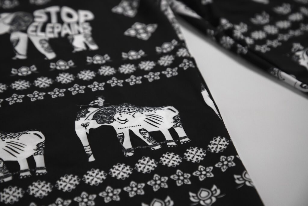 เรื่องราวเบื้องหลังการโชว์ช้างแสนรู้เหล่านี้จึงปรากฏเป็นลวดลายบน กางเกงช้าง “Stop Elepains” แสดงภาพช้างที่ถูกฝึกให้ยืนบนเก้าอี้ตัวเล็กๆ ช้างที่มีรอยแผลตามตัว ช้างนอนหมดแรง และช้างที่มีน้ำตา ซึ่งเป็นลายพิมพ์ที่มีเอกลักษณ์ต่างจากกางเกงช้างตามท้องตลาดทั่วไป