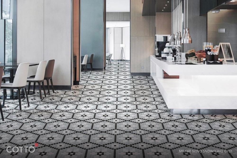 กระแสความนิยมดื่มกาแฟ กับมุมโปรดที่ให้อารมณ์แบบร้านกาแฟเก๋ ภายในบ้าน หรือมุมประกอบอาหารเล็ก ๆ ที่ให้อารมณ์สุดคูล ดูจะเป็นมุมความสุขเล็ก ๆ ที่ผู้หญิงเพศแม่ ไม่ค่อยพลาด และหลายคุณแม่ ติดจะหลงใหลแนวการตกแต่งหรือดีไซน์เก๋ ๆ ของพื้นหรือผนังที่ตกแต่งด้วยกระเบื้องชิ้นเล็ก อย่างกระเบื้องโมเสกจนต้องแอบหอบงานไปนั่งสิง อยู่บ่อย ๆ  กระเบื้องตกแต่งโมเสก ลายโนโวซีรี่ย์   เป็นกระเบื้องโมเสกเม็ดกลม เล่นสีขาว เทา ดำ วางแพทเทรินเป็นรูปหกเหลี่ยม มีลวดลายดอกไม้อยู่ภายในทำให้พื้นสวยแบบไม่ต้องตกแต่งอะไรมาก เพียงแค่เลือกโทนสีเฟอร์นิเจอร์ตกแต่งให้อยู่โทนสีกลาง  หรือเลือกใช้โทนสีขาวเป็นหลักแค่นี้ ก็ทำให้กาแฟร้อน ๆ กับอาหารจานโปรด อร่อยมากขึ้นเพราะพื้นที่ความสุขที่โอบล้อมอยู่รอบตัวเติมเต็มความอร่อยให้อิ่มเอมไปก่อนแล้ว