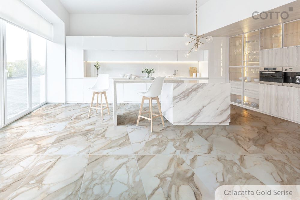 เปิดประตูสู่ธรรมชาติด้วยแสง  สี  และอากาศ  แสงจากธรรมชาติเป็นสิ่งที่ช่วยสร้างความอบอุ่นได้เป็นอย่างดี  อีกทั้งยังช่วยเพิ่มความสว่างภายในบ้านทำให้ประหยัดพลังงานไฟฟ้า  การดึงแสงธรรมชาติเข้าสู่บ้านด้วยการออกแบบประตูบานใหญ่ให้สูงจรดฝ้าเพดาน  ทำให้แสงและอากาศเข้าสู่ภายในได้สัมผัสกับธรรมชาติได้อย่างเต็มที่  นอกจากนี้การเลือกสีหลอดไฟยังมีผลต่อความรู้สึกของการอยู่อาศัยด้วย  หลอดไฟสีวอมไวท์ (Warm White) โทนแสงอุ่นนี้ทำให้รู้สึกสบายตา เพิ่มความอบอบอุ่นของห้องด้วยกระเบื้องปูพื้น GP คาลาคัตตา โกลด์ สวยด้วยดีไซน์หินอ่อนธรรมชาติ  โดดเด่นด้วยริ้วเส้นโทนสีเทาอ่อนและสีน้ำตาลทองตัดกับพื้นสีขาวที่เรียกว่า Milky White Shade เป็นการผสานโทนสีกลางให้ดูอบอุ่น กลมกลืนกับภาพรวมของการเลือกใช้ตกแต่งในห้องอาหารที่มีครัวอยู่ในตัว  มอบบรรยากาศอบอุ่นให้แก่สมาชิกในครอบครัว และมีความหรูหราสำหรับผู้ที่ชอบ Modern Luxury Style