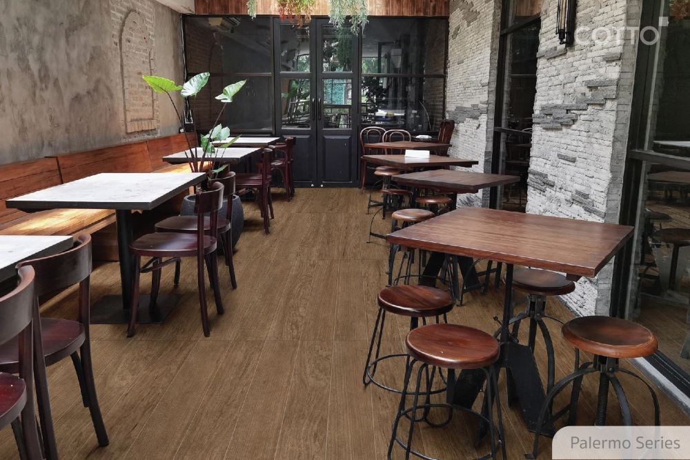 ปรับความสมดุลในความแตกต่าง การออกแบบตกแต่งบ้านควรคำนึงถึงองค์ประกอบทั้งหมด  ส่วนที่เน้นมากที่สุด  คือ วัสดุและสีที่ทำให้สิ่งแวดล้อมภายในพื้นที่สมดุลกัน   รับรู้ได้ถึงความรู้สึกผ่อนคลายจากการมองเห็นและสัมผัส    ซึ่งสามารถใช้หลักการเดียวกันในการออกแบบร้านอาหารหรือคาเฟ่  ที่ผู้คนในปัจจุบันมักใช้เป็นที่พบปะสังสรร หรือใช้เป็นที่นั่งทำงานแบบ CO- Working Space   หนึ่งในสไตล์ที่ได้รับความนิยม คือ สไตล์ลอฟท์   ที่แนวการตกแต่งทำให้พื้นที่ดูโล่ง โปร่งสบาย เน้นการโชว์โครงสร้างของอาคารเป็นหลัก  ทำผนังด้วยปูนเปลือย หรือก่ออิฐแบบที่ไม่ต้องฉาบเรียบ สำหรับพื้นเลือกไม้มาเป็นวัสดุในการตกแต่งเพื่อลดความดิบของปูนหรืออิฐ  กระเบื้องปูพื้นลายไม้  ปาแลร์โม  มีลวดลายและสัมผัสเหมือนไม้ธรรมชาติ  เต็มเปี่ยมด้วยนวัตกรรมของไฮจินิกไทล์ที่มีสารซิลเวอร์นาโนป้องกันเชื้อแบคทีเรียได้ถึง 90%  ผิวหน้ามีร่องลึกของลายไม้ด้วยค่า R11  ที่ช่วยลดความเสี่ยงจากการลื่นล้มหากพื้นเปียกน้ำ   สำหรับเฟอร์นิเจอร์เพิ่มความอบอุ่นแบบโฮมมี่มากยิ่งขึ้น  เลือกวัสดุโดยให้ท๊อปโต๊ะทำด้วยไม้ ส่วนขาใช้เหล็กทาสีดำ  วางแบบลอยตัว  เพิ่มความซอฟต์ด้วยต้นไม้จริง ไม่ว่าจะเป็นต้นไม้กระถางขนาดเล็ก หรือต้นไม้แขวนประดับ