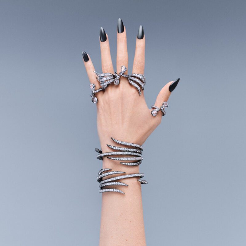คริสตัลใสเปล่งประกายถูกผสานเข้ากับดีเทลสีรูทีเนียม เกิดเป็นคอนทราสต์อันโดดเด่นทำให้ดีไซน์ดูเฉียบคม เสริมด้วยงานประดับแบบ Pavé และการจัดวางคริสตัลทรงบาแกตต์และหลากหลายรูปทรงในขนาดต่างๆ ที่สะท้อนแสงให้คริสตัลดูเปล่งประกายยิ่งขึ้น กรอบสีรูทีเนียมเข้มที่ล้อมรอบคริสตัลแต่ละเม็ดช่วยขับให้รูปทรงของขนนกชัดเจนและมีมิติมากยิ่งขึ้น