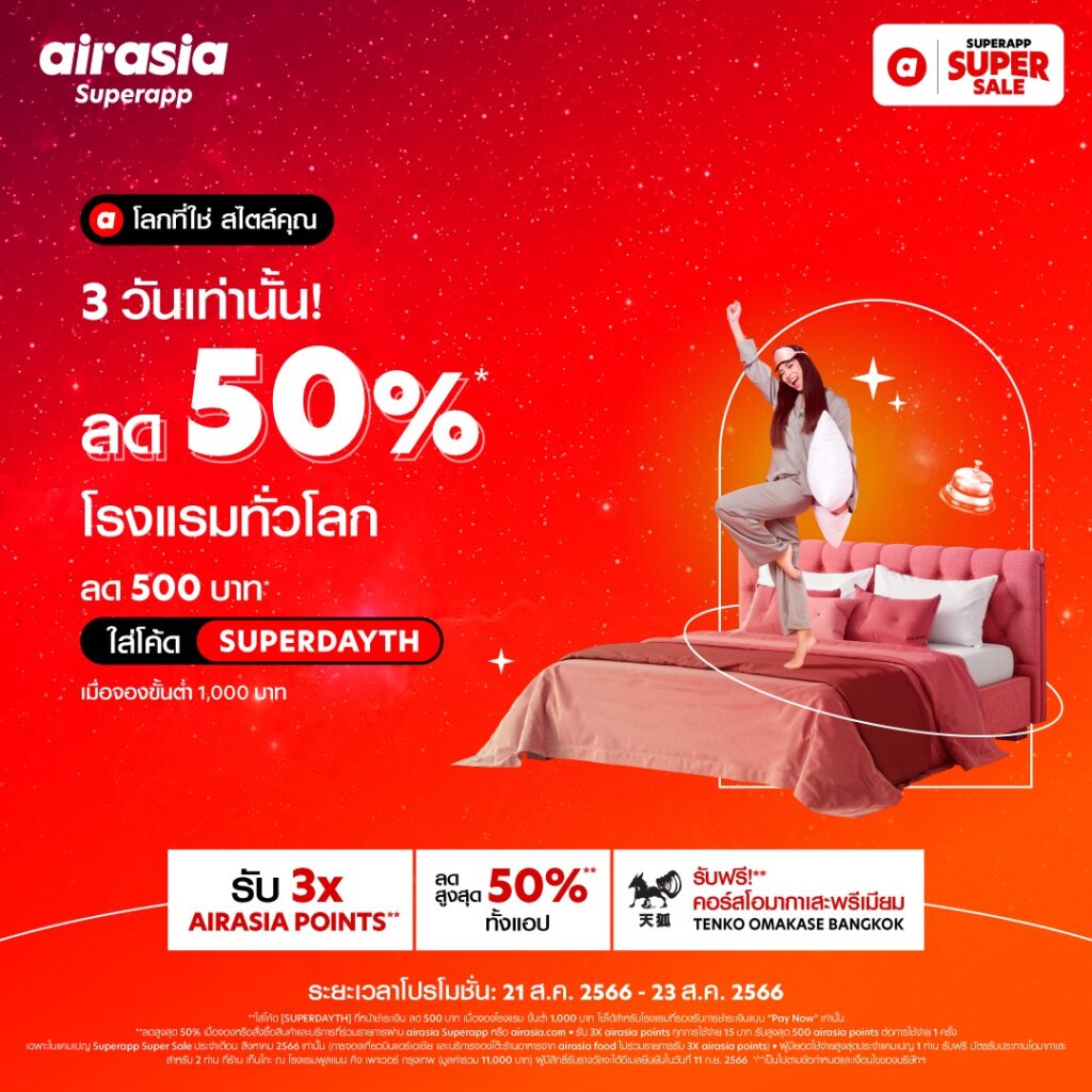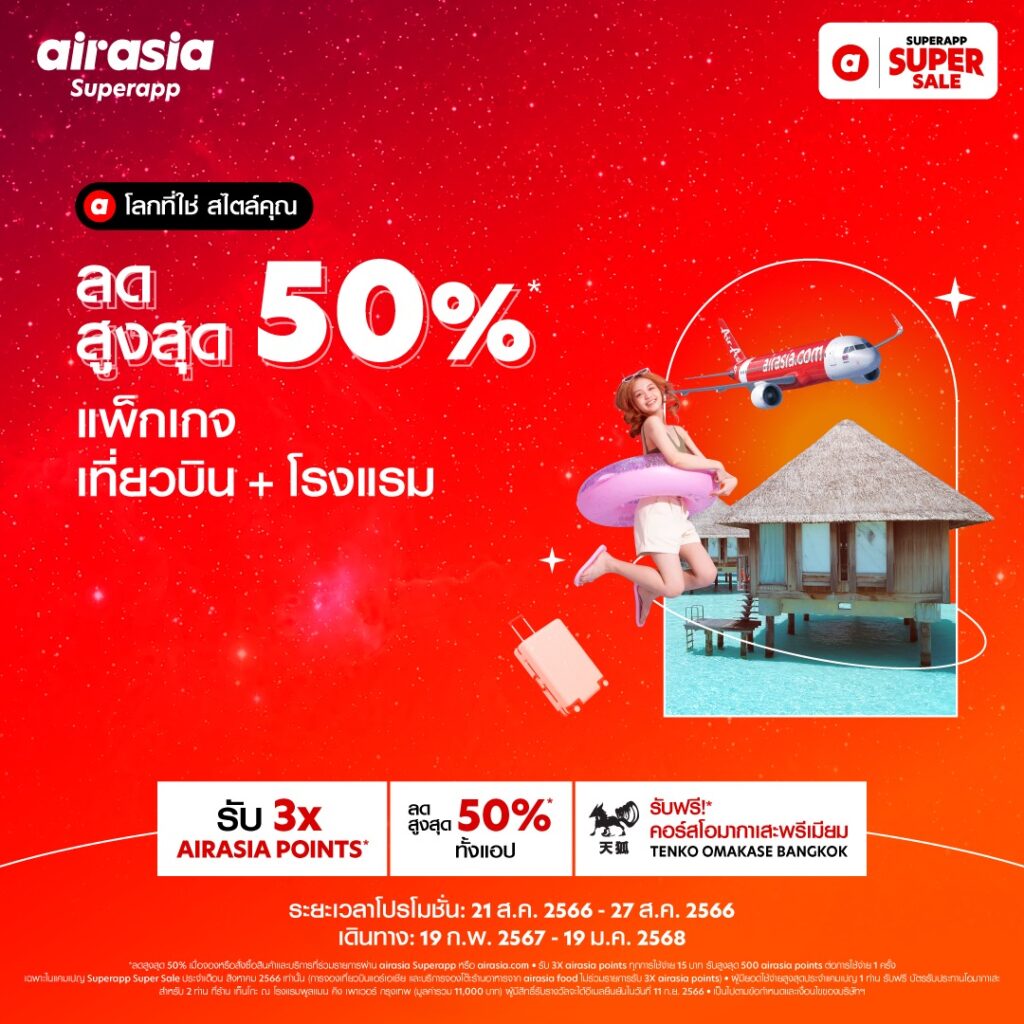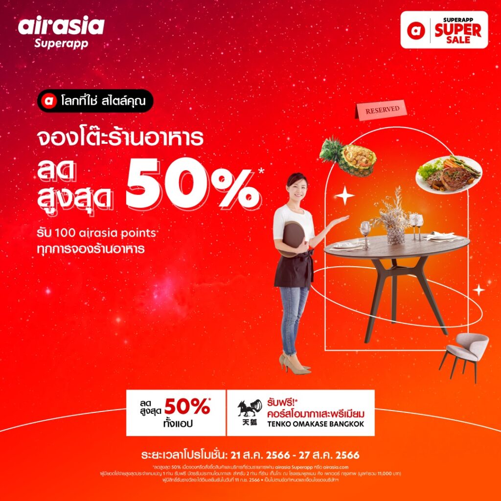 airasia Superapp สานต่อความสำเร็จของโปรสุดคุ้มประจำเดือนที่ขาเที่ยวรอคอย “Superapp Super Sale” ด้วยโปรใหญ่ลดคุ้มสะใจ ลดสูงสุด 50%* และช้อปสูงสุดรับฟรี! คอร์สโอมากาเสะสุดพรีเมียมร้าน Tenko Omakase จาก PULLMAN BANGKOK KING POWER** มูลค่า 11,000 บ.