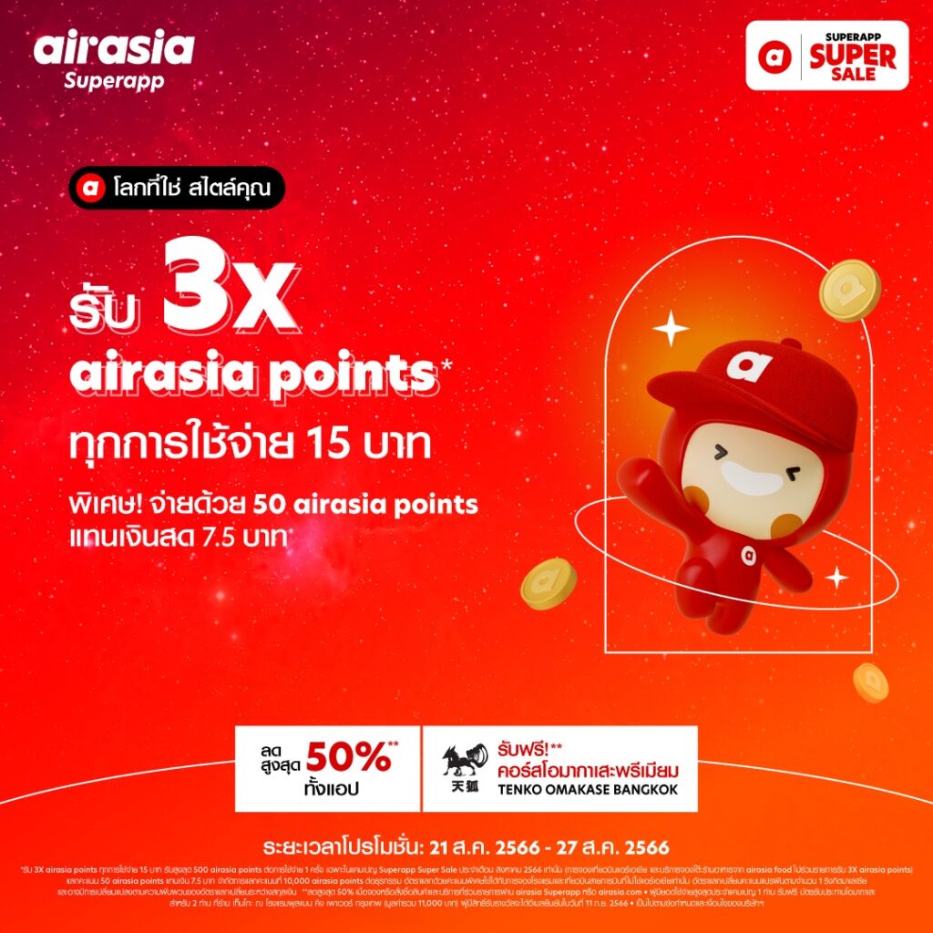 สมาชิกสามารถรับ airasia points ได้ถึง 3 เท่า*** จากการซื้อสินค้าและบริการบน airasia Superapp ซึ่งคะแนนที่ได้รับนี้สามารถใช้จ่ายแทนเงินเมื่อซื้อสินค้าและบริการบน airasia Superapp ได้แก่ เที่ยวบินสายการบินพันธมิตร ค่าห้องพักโรงแรม SNAP (จองเที่ยวบิน+โรงแรม) เรียกรถยนต์รับส่งผ่าน airasia ride และซื้อบัตรโดยสารสาธารณะจาก airasia transport