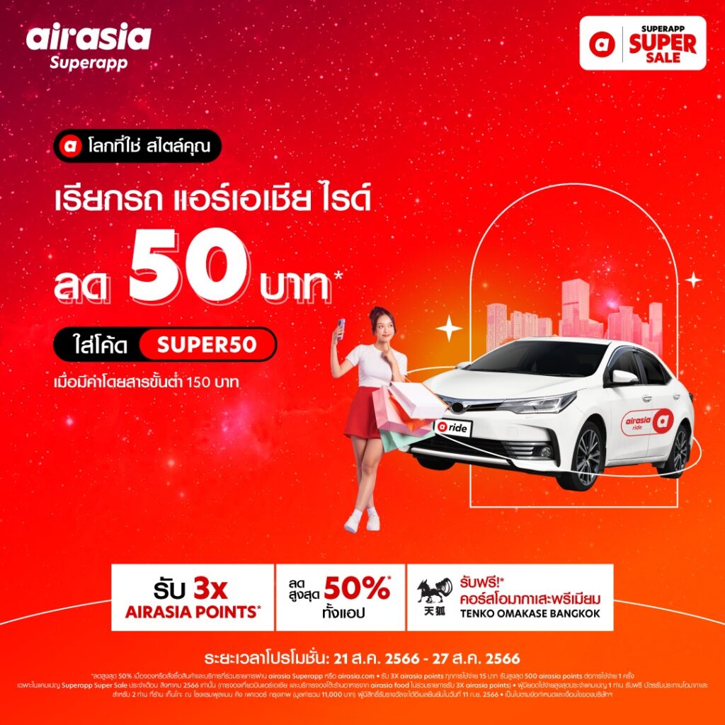 เพื่อให้การเดินทางทุกวันของคุณพบกับความสะดวกสบาย airaisa ride พร้อมให้บริการเรียกรถยนต์หรือรถแท็กซี่ รับ-ส่งทุกที่ ทุกเวลา ไม่ว่าคุณจะเดินทาง ไปทำงาน กลับบ้าน ไปเที่ยวพักผ่อน หรือไปสนามบิน ก็เรียกใช้บริการเรียกรถยนต์รับ-ส่งจาก airasia ride ได้แล้ววันนี้ พร้อมรับทันทีส่วนลด 50 บาท เพียงใส่โค้ดส่วนลด “SUPER50” เมื่อมีค่าโดยสารขั้นต่ำ 150 บาท* และยังสามารถจองรถล่วงหน้าได้อีกด้วย ให้คุณหมดห่วงทุกเรื่องการเดินทาง ได้รถชัวร์ ได้รถไว ไม่มีผิดแผน จองล่วงหน้าง่ายๆ เพียง