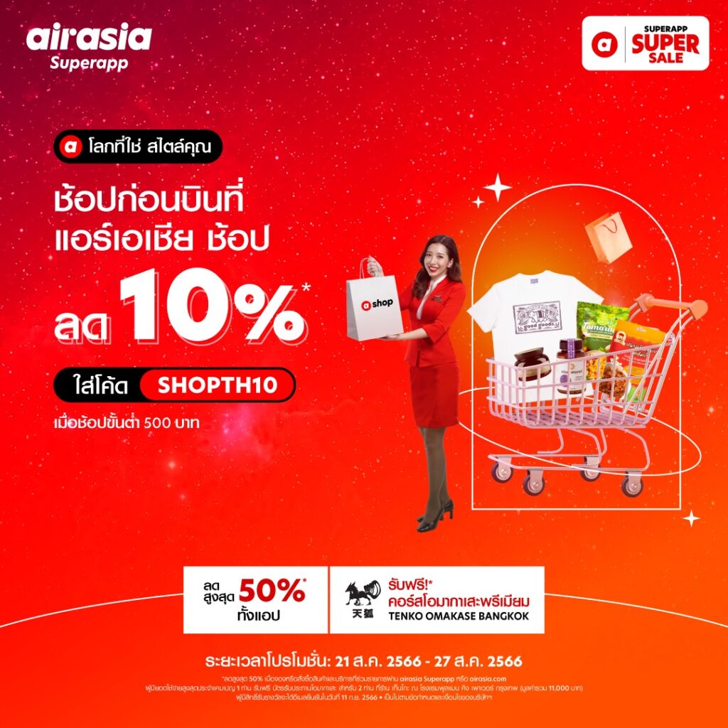 สั่งล่วงหน้าก่อนบิน รับสินค้าบนเที่ยวบิน ส่งตรงถึงที่นั่งคุณ เพียงกรอกโค้ด [SHOPTH10] รับส่วนลด 10% เมื่อช้อปขั้นต่ำ 500 บาท(ส่วนลดสูงสุด 50 บาท) เลือกไอคอน ‘Shop’ บน airasia Superapp แล้วเริ่มช้อปกันได้เล้ยย!