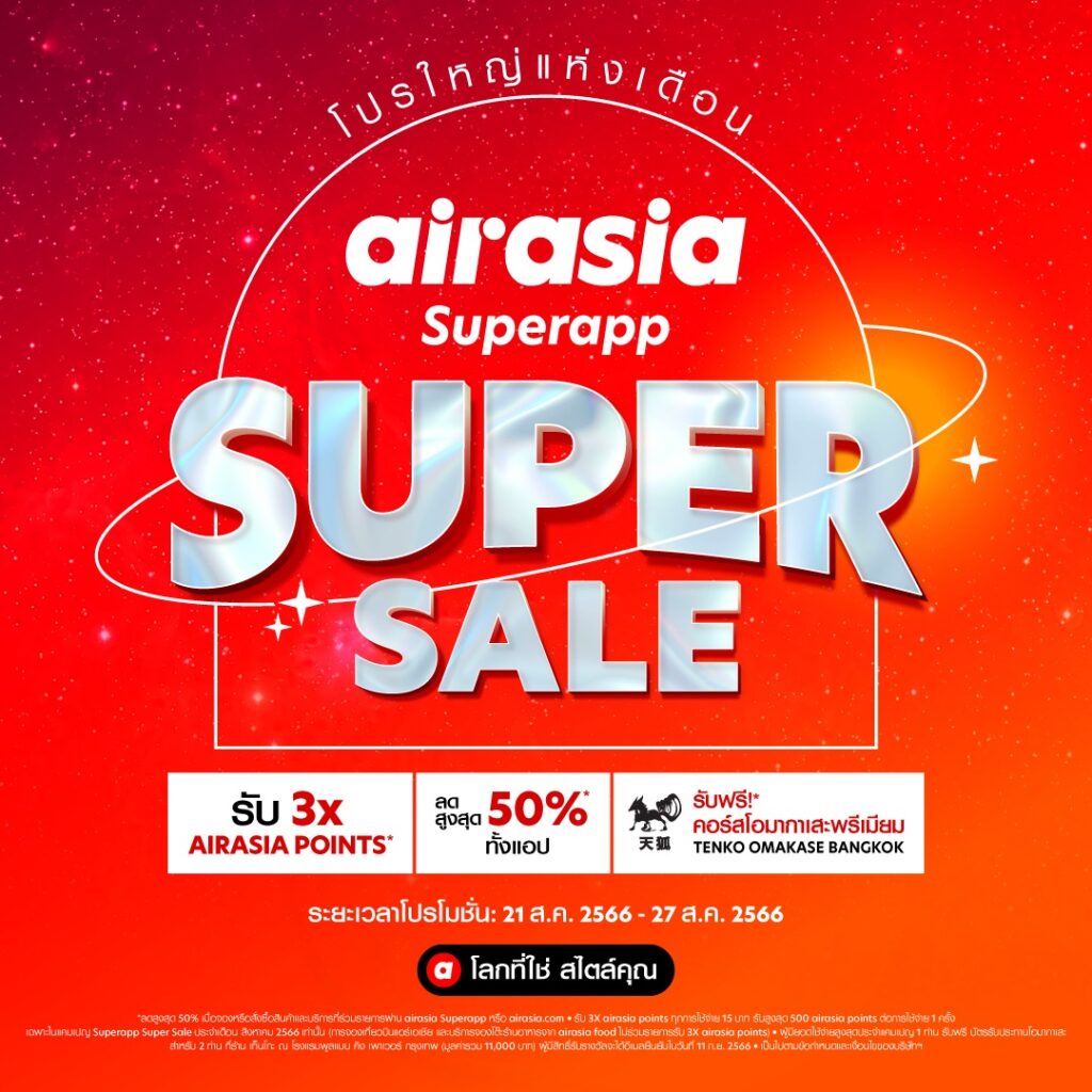 airasia Superapp สานต่อความสำเร็จของโปรสุดคุ้มประจำเดือนที่ขาเที่ยวรอคอย “Superapp Super Sale” ด้วยโปรใหญ่ลดคุ้มสะใจ ลดสูงสุด 50%* และช้อปสูงสุดรับฟรี! คอร์สโอมากาเสะสุดพรีเมียมร้าน Tenko Omakase จาก PULLMAN BANGKOK KING POWER** มูลค่า 11,000 บ.