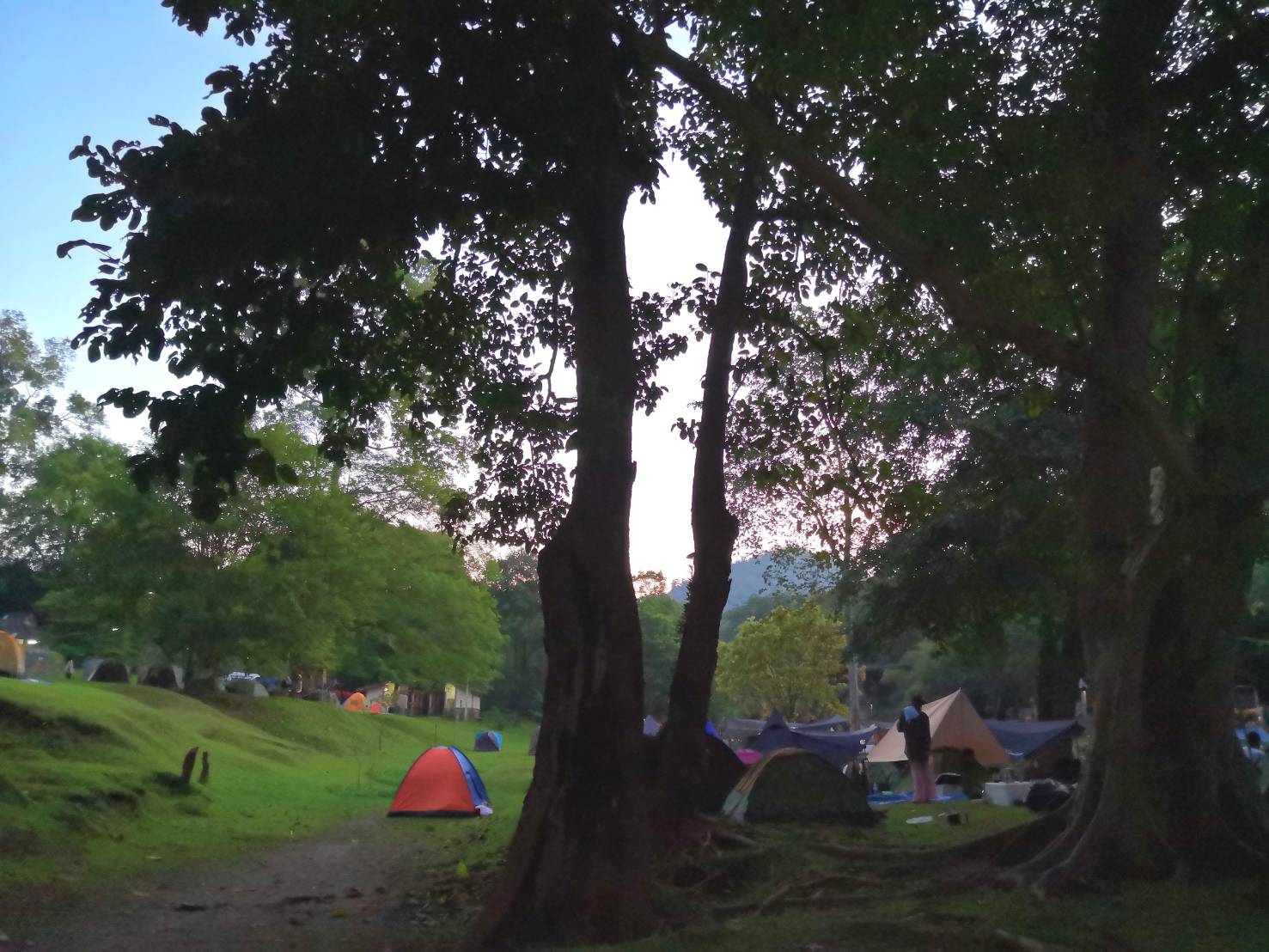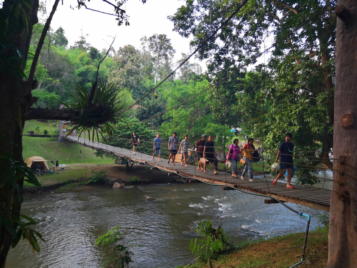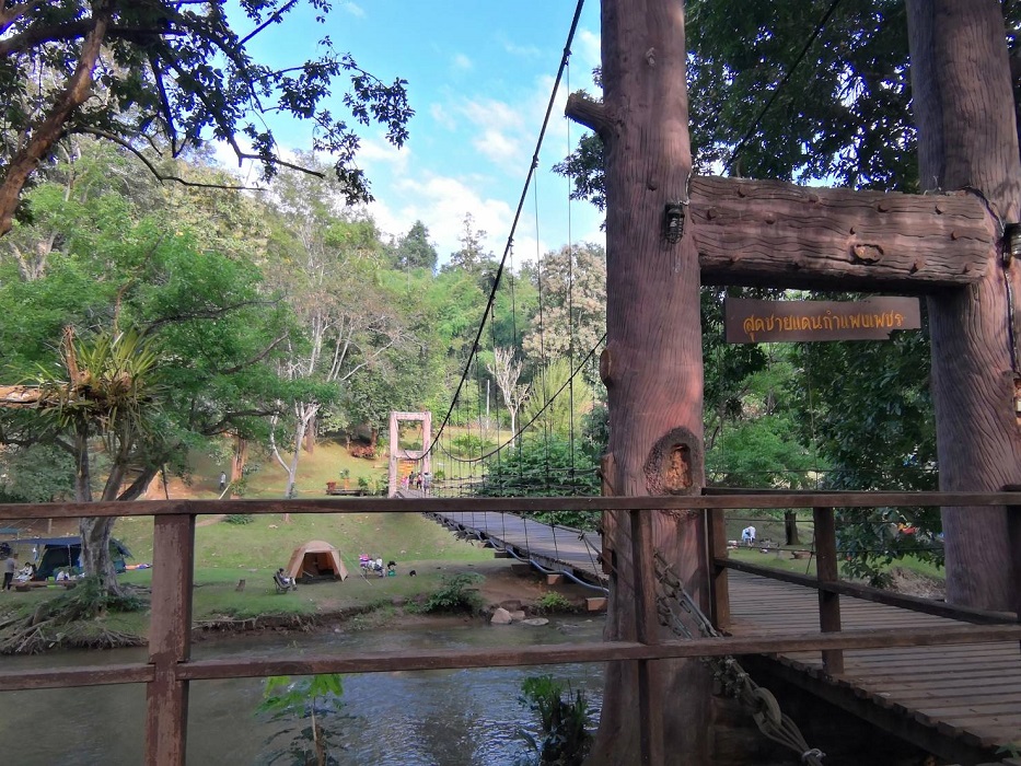 ส่วนนกที่ตื่นสายก็ต้องหอบข้าวของข้ามสะพานขึงไปกางเต็นท์ทางฝั่งจังหวัดตากตามระเบียบ โดยทางอุทยานมีรถเข็นให้ยืมเพื่อการขนย้ายเฟอร์นิเจอร์ทั้งหลาย