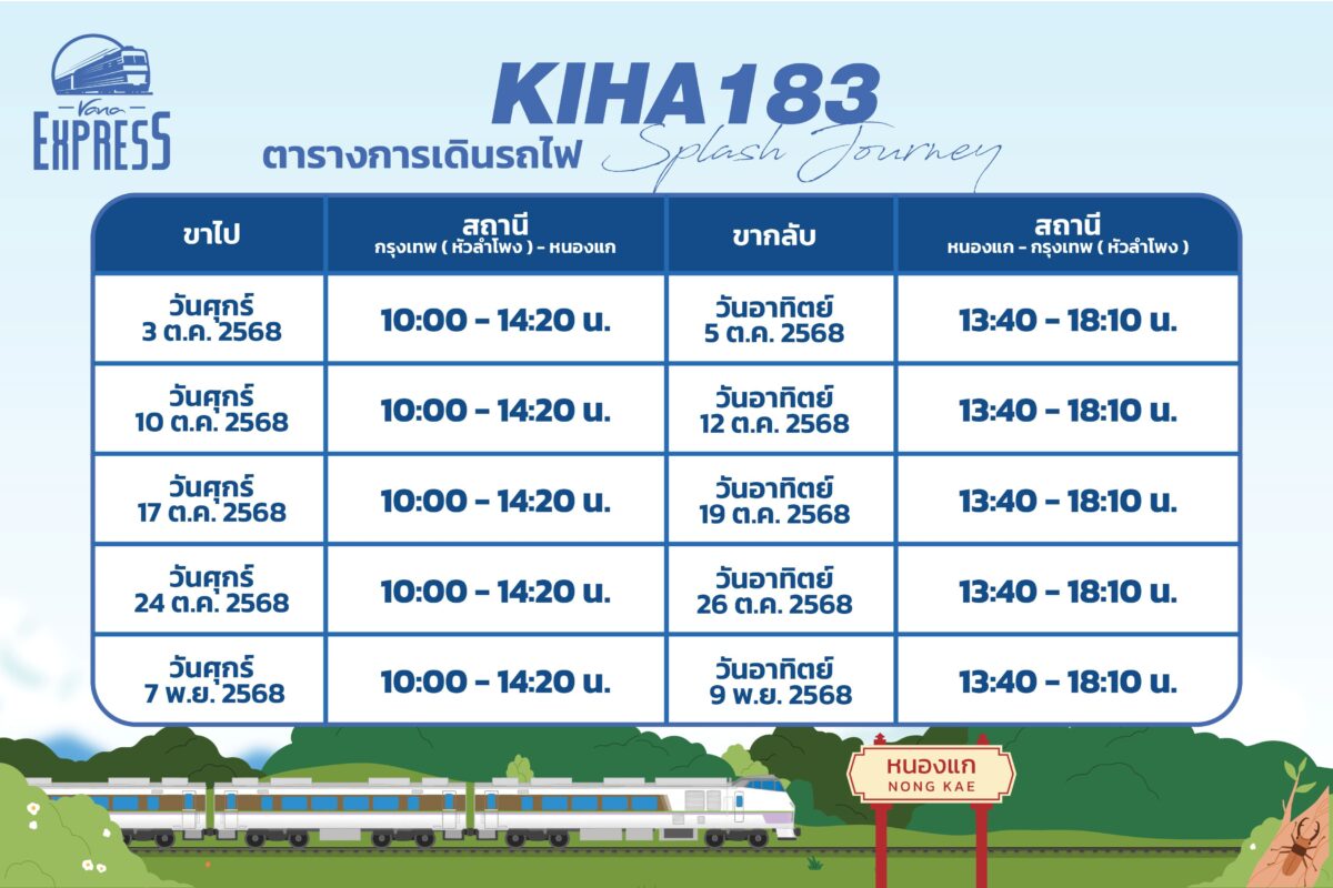 KIHA 183 Splash Journey ไม่ใช่เพียงการนั่งรถไฟ แต่คือการสร้างความทรงจำที่พิเศษระหว่างการเดินทาง การพักผ่อน และการใช้เวลาร่วมกันของครอบครัว กลุ่มเพื่อน หรือ กลุ่มคู่รัก เราต้องการให้นักท่องเที่ยวทุกท่านได้สัมผัสหัวหินในมุมใหม่ที่ครบทุกมิติ ทั้งการเล่นน้ำที่สวนน้ำ วานา นาวา การพักผ่อนในโรงแรมระดับ 5 ดาว ไปจนถึงการสัมผัสเสน่ห์ของเมืองหัวหิน ไม่ว่าจะเป็นชายหาดยามเช้า ตลาดซิเคด้า ตลาดแทมมารีน หรือวัดหนองแก ซึ่งสะท้อนความมีชีวิตชีวาของเมืองตากอากาศแห่งนี้อย่างแท้จริง