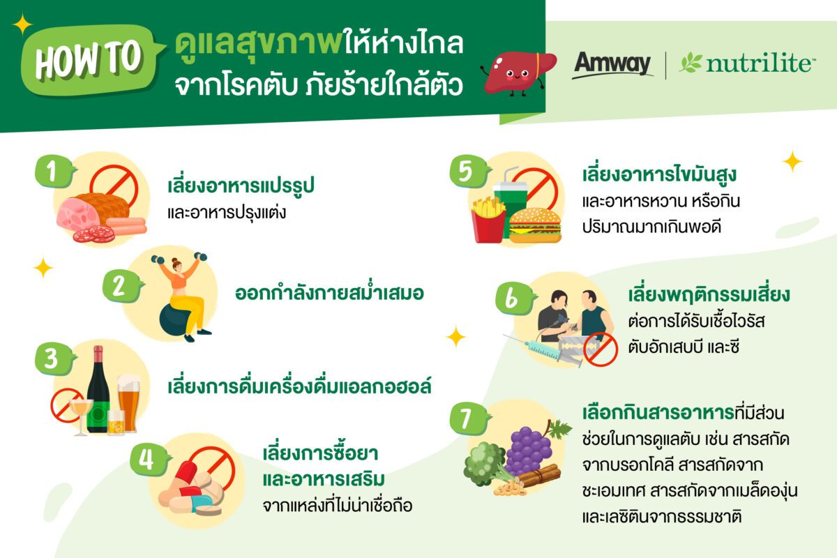 “นิวทริไลท์” จาก แอมเวย์ ผู้นำตลาดวิตามินและผลิตภัณฑ์เสริมอาหารที่ดูแลผู้คนทั่วโลกมา 90 ปี  ตระหนักและพร้อมผลักดันให้ผู้คนได้มีสุขภาพและสุขภาวะที่ดี ได้เล็งเห็นถึงปัญหาสุขภาพตับของประชากรไทยที่ต้องเผชิญ จึงขอแนะนำวิธีดูแลสุขภาพให้ห่างไกลจากโรคตับภัยร้ายใกล้ตัว มีทั้งหมด 7 ข้อ ดังนี้