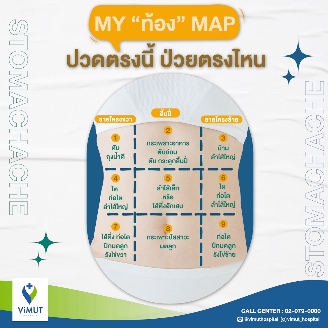 ลักษณะอาการปวดท้องที่คนไข้สามารถสังเกตตัวเองได้คือแบบที่ 2 หรือการปวดท้องตามตำแหน่งของอวัยวะ ซึ่งในทางการแพทย์จะแบ่งช่องท้องของคนไข้เป็น 9 โซน ได้แก่